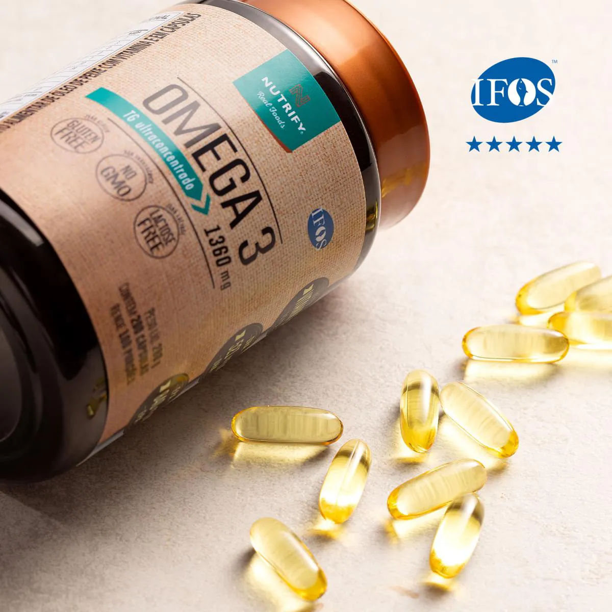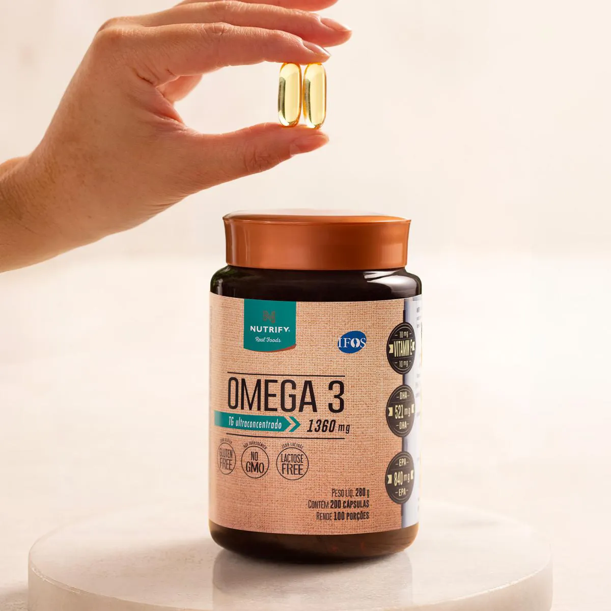 Alta concentração para expandir benefícios Ômega 3 Nutrify é formulado com óleo de peixe de altíssimo grau de pureza e concentração. Oferece o nutriente na sua forma de triglicerídeos - a mais biodisponível. Poucos óleos no mundo são tão concentrados: fornece 840 mg de EPA e 521 mg de DHA em apenas duas cápsulas. Certificado pelo IFOS, em virtude de sua qualidade, pureza, segurança e ausência de metais pesados.