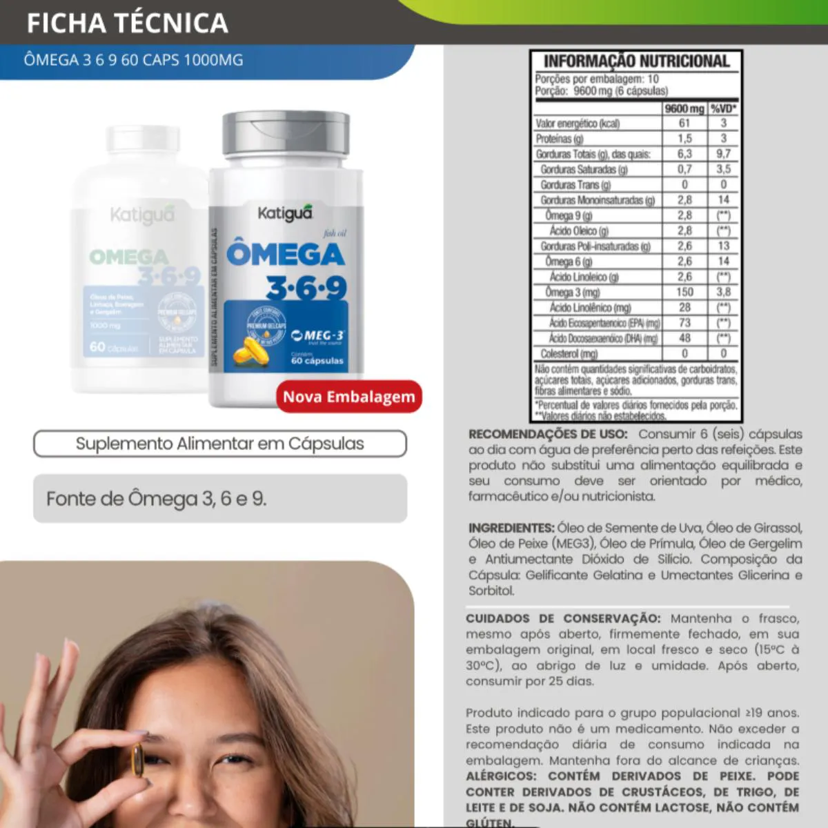 O Ômega 3-6-9 Katiguá é uma combinação balanceada de ácidos graxos essenciais obtidos de fontes vegetais e marinhas, formulado para auxiliar na ingestão equilibrada de gorduras boas.Benefícios: