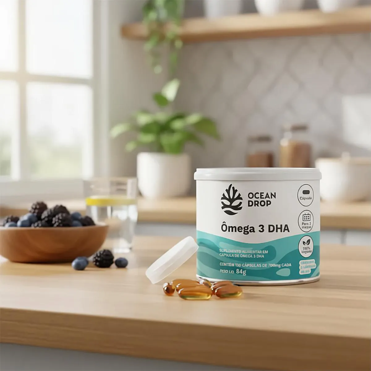 - Fonte vegana de DHA extraído de algas marinhas.