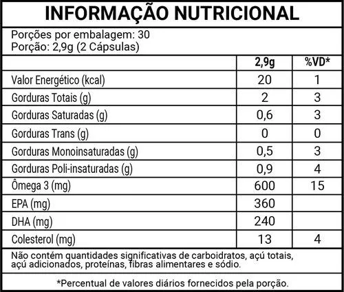 Ingredientes: Óleo de peixe (Ômega 3) e antioxidante alfa-tocoferol; Composição da cápsula: gelatina, umectante glicerina e água.