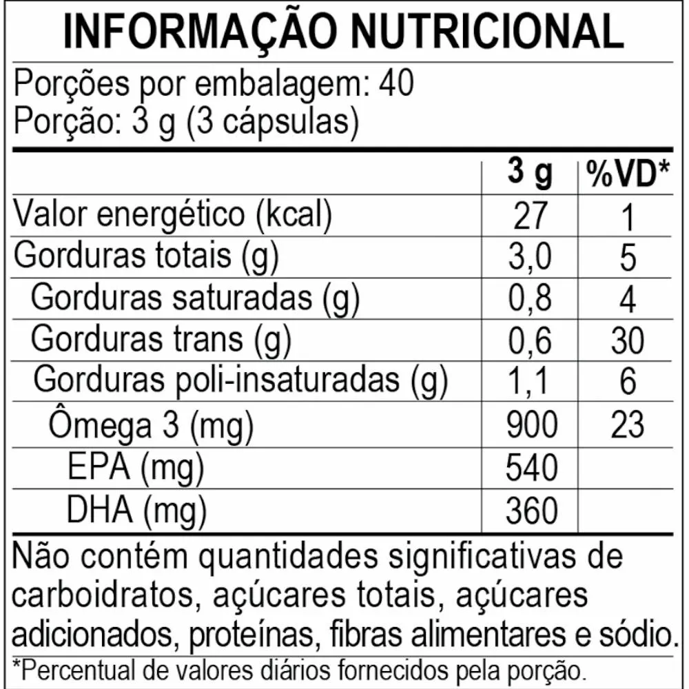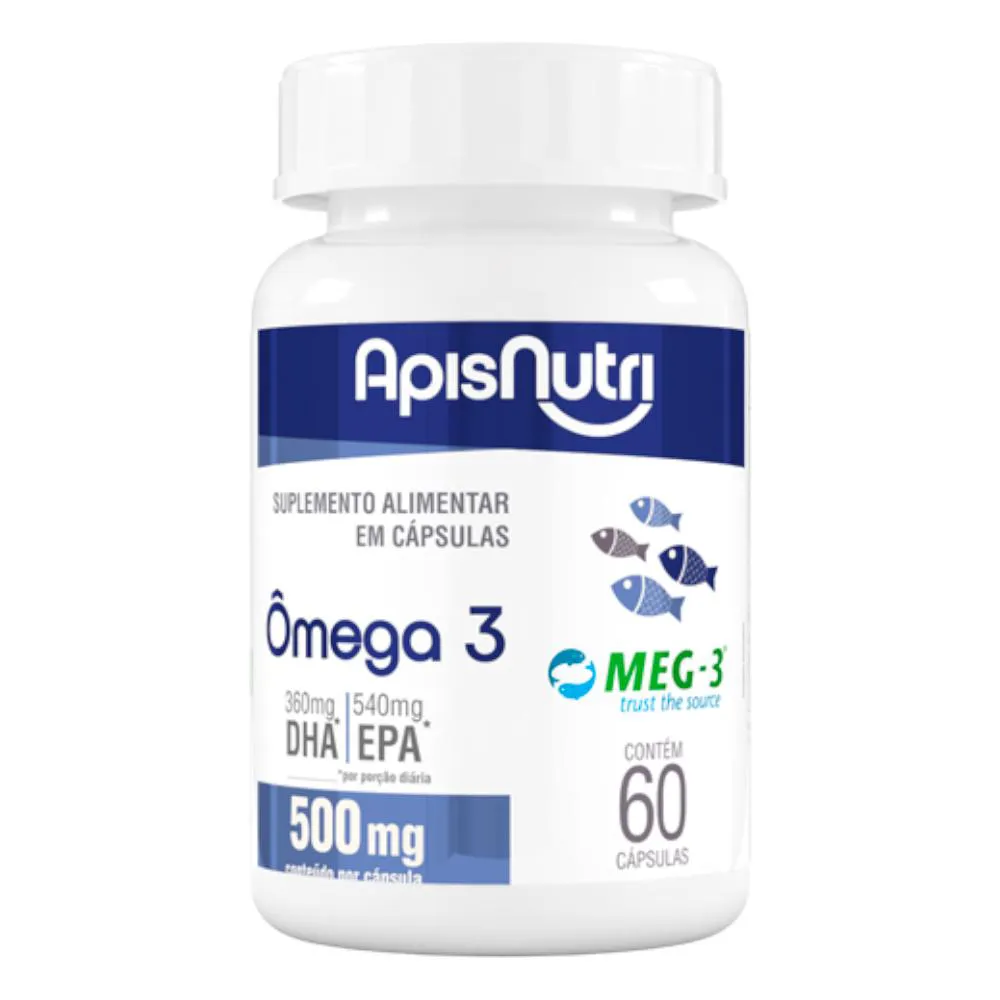 Ômega 3 EPA DHA Apisnutri 60 Cápsulas Sobre o produto É um suplemento à base de óleo de peixe, contendo EPA e DHA, considerado uma 'gordura boa' e essencial, pois não pode ser produzido naturalmente pelo organismo, devendo, portanto, ser obtido através da alimentação e/ou suplementação. O selo MEG-3 garante a qualidade das matérias-primas utilizadas na fabricação do suplemento. O óleo de peixe com esta certificação é altamente purificado e também é rico em EPA e DHA, os principais tipos de ácidos graxos ômega 3. Modo de usar Ingerir 06 (seis) cápsulas ao dia. Recomendação de uso: 19 (dezenove) anos ou acima. Ingredientes Ingredientes: Óleo de peixe e antioxidante: acetato de DL-alfa-tocofero. Cápsula: gelatina. ALÉRGICOS: CONTÉM DERIVADOS DE PEIXE. NÃO CONTÉM GLÚTEN. “Este produto não é um medicamento.” “Não exceder a recomendação diária de consumo indicada na embalagem.” “Mantenha fora do alcance de crianças.” “Este produto não deve ser consumido por gestantes, lactantes e crianças.” Manter a embalagem bem fechada em local seco e fresco. Não expor à luz solar. Consumir em até 30 dias após aberto. Produto dispensado de registro conforme RDC 240/2018. Apresentação Classificação: Suplemento alimentar de óleo de peixe em cápsulas Quantidade de cápsulas: 60 cápsulas de 500 mg Peso Líquido: 30g