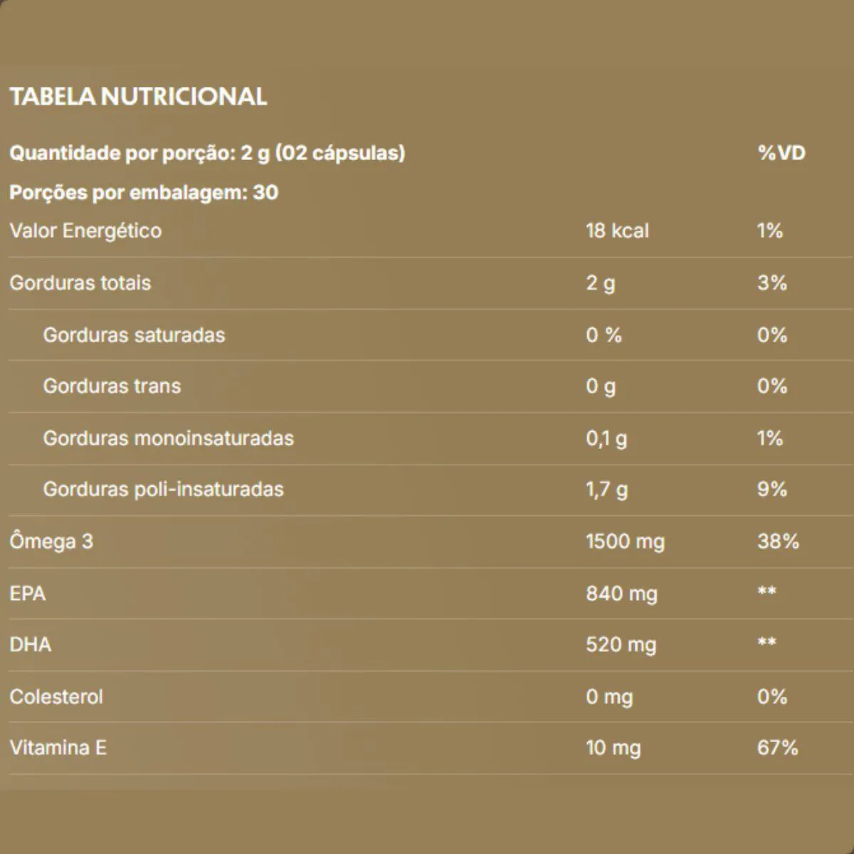 A composição utiliza óleo de peixe purificado, processado para garantir um perfil livre de metais pesados. Esse cuidado na escolha da matéria-prima reforça o compromisso da marca com padrões elevados de qualidade. A fórmula é objetiva, mantendo apenas os elementos essenciais para a entrega do ingrediente principal. Com 60 cápsulas por frasco, o rendimento é adequado para acompanhar semanas de uso planejado, permitindo que a suplementação seja feita de maneira organizada e simples.
