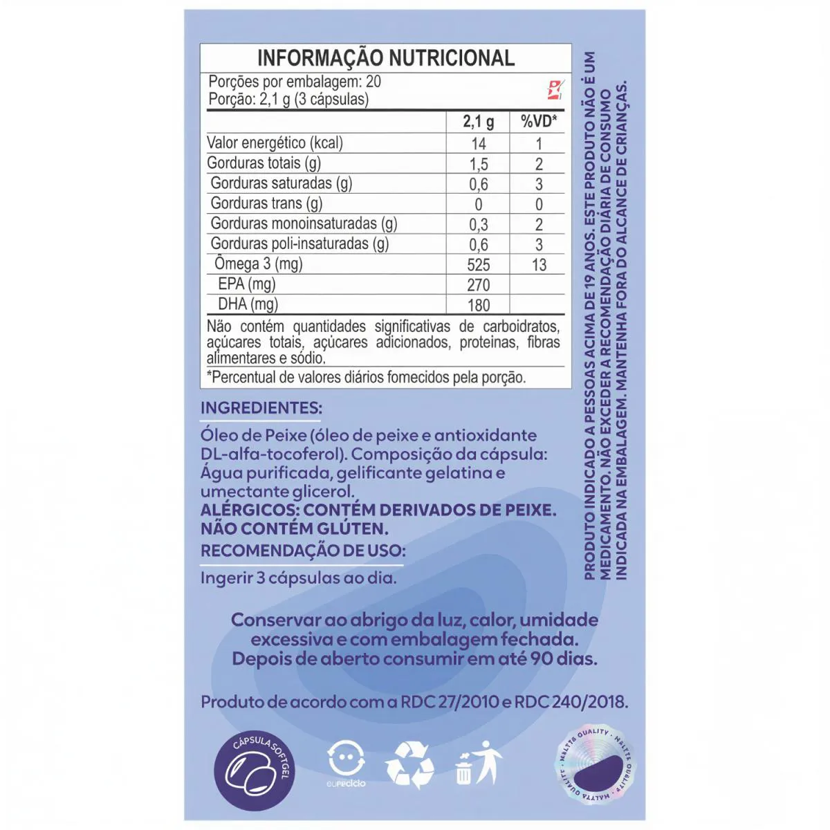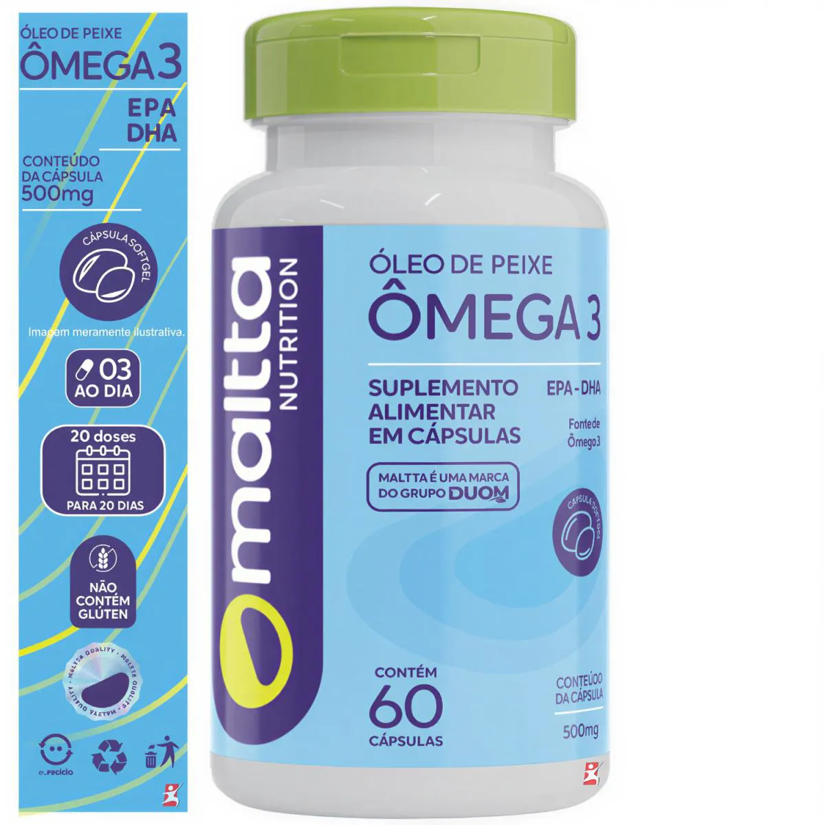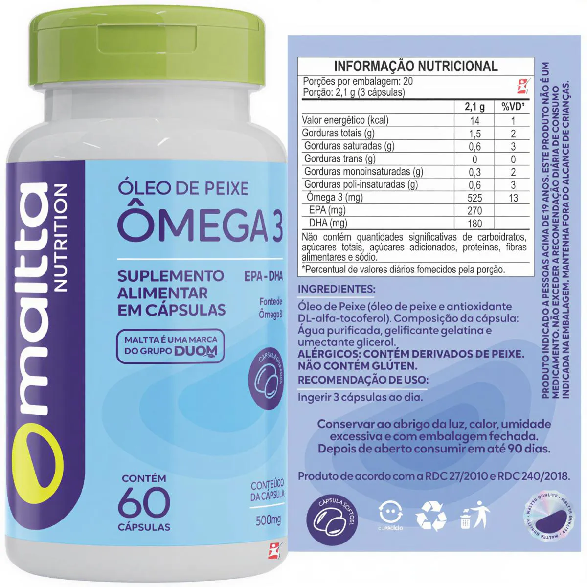 ÔMEGA 3 ULTRA PURIFICADO EPA-DHA 500MG 60 CÁPSULAS SOFTGEL - MALTTA NUTRITION DESCRIÇÃO É um suplemento alimentar em cápsulas, fundamental para a manutenção da saúde vascular e cerebral, ajudando também na manutenção dos níveis saudáveis de triglicerídeos. Possuí o selo Meg-3®. Atesta que os peixes são dos mares do norte do Canadá que se trata de um local livre de poluição e livres de metais pesados, como chumbo e mercúrio que são tóxicos para o corpo humano. BENEFÍCIOS - Ultra purificado; - Livre de metais pesados; - Peixe de águas profundas; - Apenas 3 cápsulas ao dia; - 270mg de EPA por porção (3 cápsulas); - 180mg de DHA por porção (3 cápsulas); - 500mg de óleo de peixe por cápsula; - Cada frasco rende 20 doses/porções; - Selo Meg-3®; - Não contém glúten; - Selo eureciclo®. SUGESTÃO DE USO Ingerir 3 cápsulas ao dia. TABELA NUTRICIONAL - COMPOSIÇÃO e RECOMENDAÇÕES Anexo nas imagens. DADOS TÉCNICOS Registro ANVISA – Produto de acordo com a RDC nº 24/2010 e RDC nº 240/2018. Marca – Duom: MALTTA NUTRITION. Conteúdo líquido total – 60 cápsulas. Rendimento líquido total – 20 doses/porções. Peso líquido total – 42g. Peso bruto total – 71g. Peso aproximado produto + embalagem (aproximado) – 150g. Código de barras (EAN) – 7898938440431. Dimensões do produto – largura: 6cm; altura: 11cm; comprimento: 4,5cm. Dimensões da embalagem/pacote – largura: 13cm; altura: 7cm; comprimento: 16cm. ITENS DO ANÚNCIO 1 Unidade do produto: ÔMEGA 3 ULTRA PURIFICADO EPA-DHA 500MG 60 CÁPSULAS SOFTGEL - MALTTA NUTRITION. Total – 60 Cápsulas POR FRASCO.
