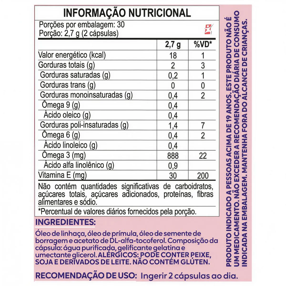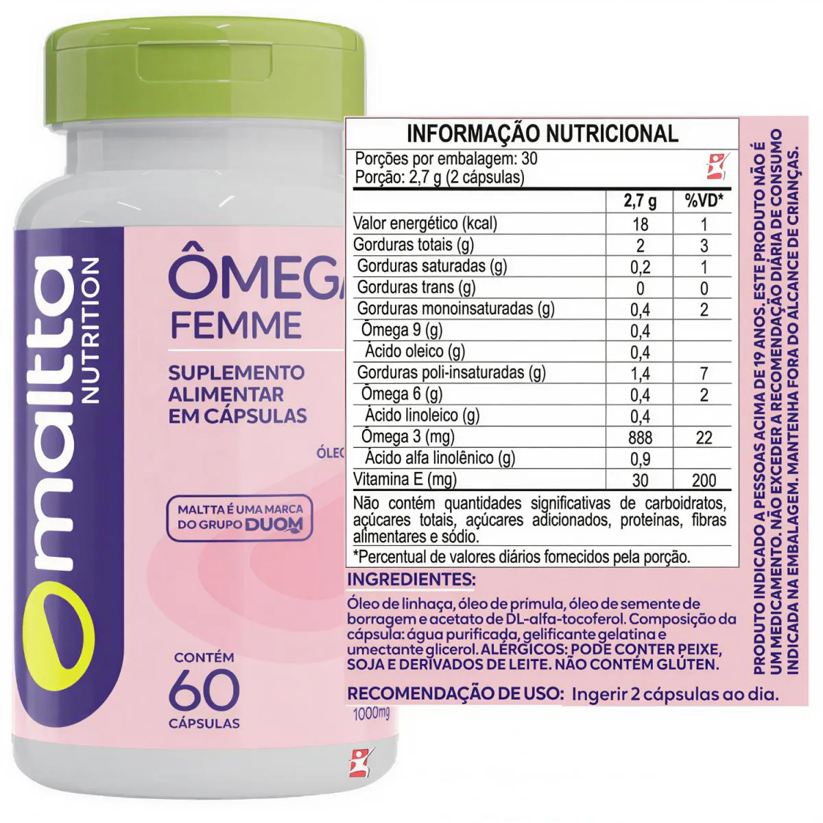 OMEGA FEMME - PRÍMULA + BORRAGEM + LINHAÇA + vitamina E SAÚDE E beleza DA MULHER 60 CAPSULAS: DUOM - MALTTA NUTRITION   DESCRIÇÃO O Composto de BLEND de óleos – OMEGA FEMME –, possui quádrupla proteção, deixando você mais saudável. Com óleo de peixe, linhaça, borragem e óleo de prímula em uma única cápsula e rico em EPA e DHA.   O óleo de Borragem é extraído das sementes da flor borragem. O óleo de linhaça é extraído das sementes da planta linho. O óleo de prímula é extraído das sementes dessa planta.O ômega Femme é a fonte do ácido alfa-linolênico n-3 (ômega 3) (ALA) e ácido linoléico n-6 (ômega 6)   BENEFÍCIOS - Apenas 2 cápsulas ao dia; - Cápsulas Softgel; - Óleo de Linhaça; - Óleo de Prímula; - Óleo de Borragem; - vitamina e; - Antioxidante.   SUGESTÃO DE USO Ingerir 2 cápsulas ao dia.   TABELA NUTRICIONAL -COMPOSIÇÃO & RECOMENÇÕES Anexo nas imagens.    DADOS TÉCNICOS Registro ANVISA – Produto de acordo com a RDC nº27/2010 e RDC 240/2018. Marca – Duom. Conteúdo líquido total – 60 Cápsulas. Rendimento líquido total – 30 doses/porções. Peso líquido total – 81g. Peso bruto total – 150g. Peso aproximado produto + embalagem – 250g.