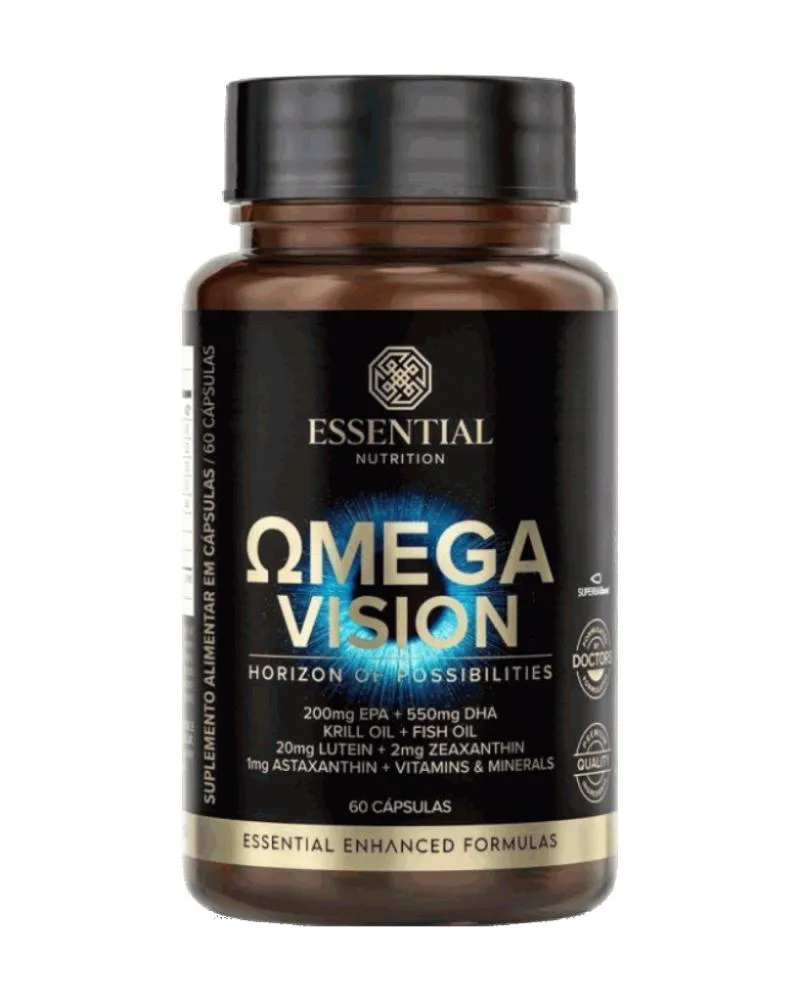 Omega Vision (60 caps) - Essential NutritonA exposição constante à poluição, raios solares, bactérias e ao excesso de luz azul artificial, emitida por aparelhos eletrônicos, pode prejudicar a visão ao longo dos anos. Com Omega Vision você tem um horizonte de possibilidades no cuidado da sua visão. Omega Vision (60 caps) Essential Nutrition é um suplemento de ômega-3 formulado com óleo de peixe (TG) e óleo de krill, com alta concentração de DHA, enriquecido com luteína, zeaxantina e astaxantina, somado aos minerais zinco e cobre e às vitaminas A, C e E. As vitaminas C e E e o cobre são antioxidantes que auxiliam na proteção dos danos causados pelos radicais livres. O zinco e a vitamina A auxiliam na visão.- ENTENDA UM POUCO MAIS SOBRE OS SELOS EXISTENTES NO ÔMEGA VISION: ** SELO SUPERBA BOOST: A matéria-prima da Superba Boost foi desenvolvida usando uma nova tecnologia exclusiva da Aker BioMarine chamada Flexitech, tecnologia patenteada que utiliza exclusivamente métodos de fracionamento eficientes a baixas temperaturas, remove sais indesejados e outros constituintes polares, concentrando apenas os componentes benéficos. ** SELO PRONOVA PURE: Um dos diferenciais que faz do Ômega Joint o melhor ômega 3 do mercado são os seus selos de certificações internacionais de qualidade. A exemplo o Selo Pronova Pure: Confirmando a utilização do óleo de peixe a partir de peixes gordurosos de águas geladas, profundas e não contaminadas da Noruega. Benefícios: * Antioxidantes que auxiliam na proteção dos danos causados pelos radicais livres;* Auxilia na visão;* Ajuda a construir e estruturar as bainhas de mielina;* Evitar a formação de trombos (coágulos) no sangue;* Potencial antioxidante.