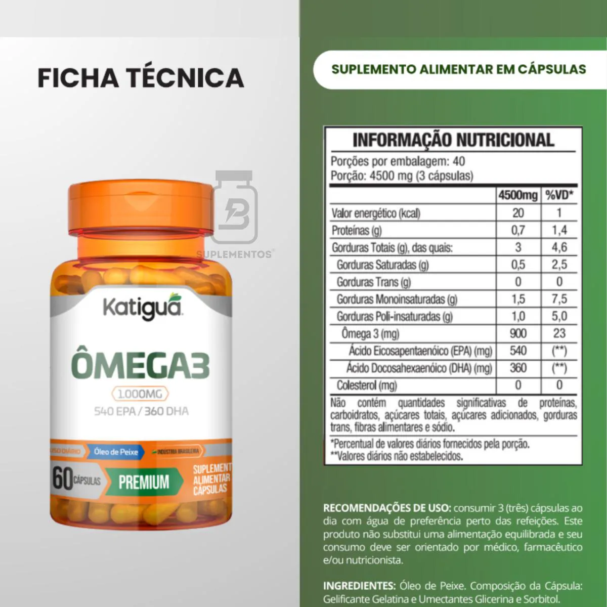 Modo de uso: Ingerir 2 cápsulas ao dia. Katiguá – Puro ômega 3 para um coração saudável.