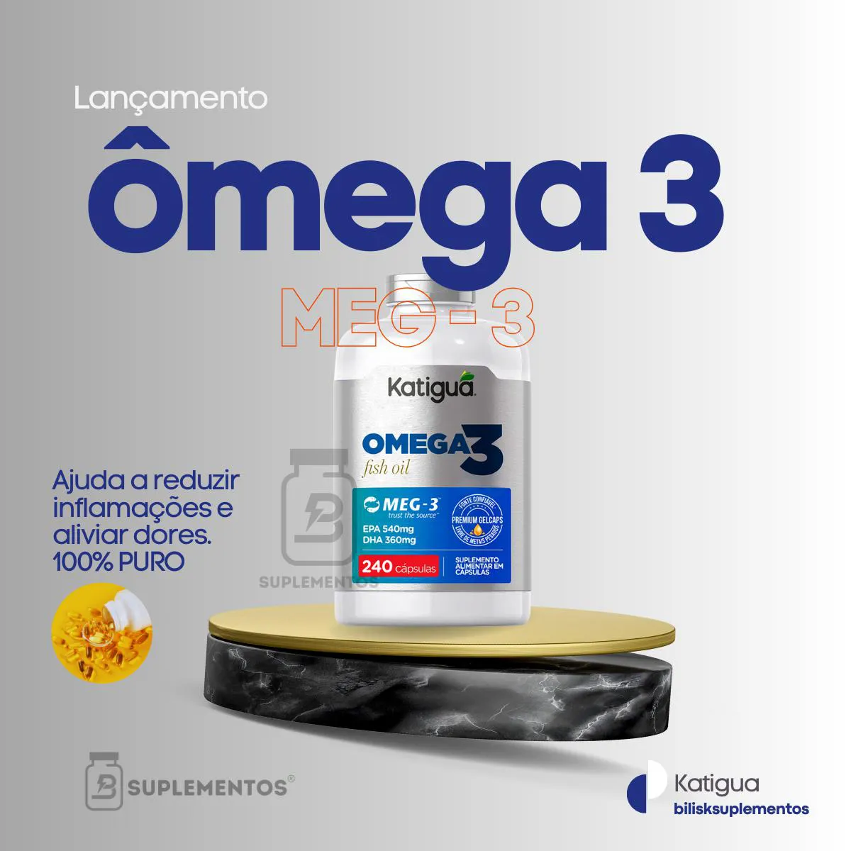 Suplemento alimentar em cápsulas com óleo de peixe concentrado, rico em ácidos graxos essenciais EPA e DHA.Benefícios: