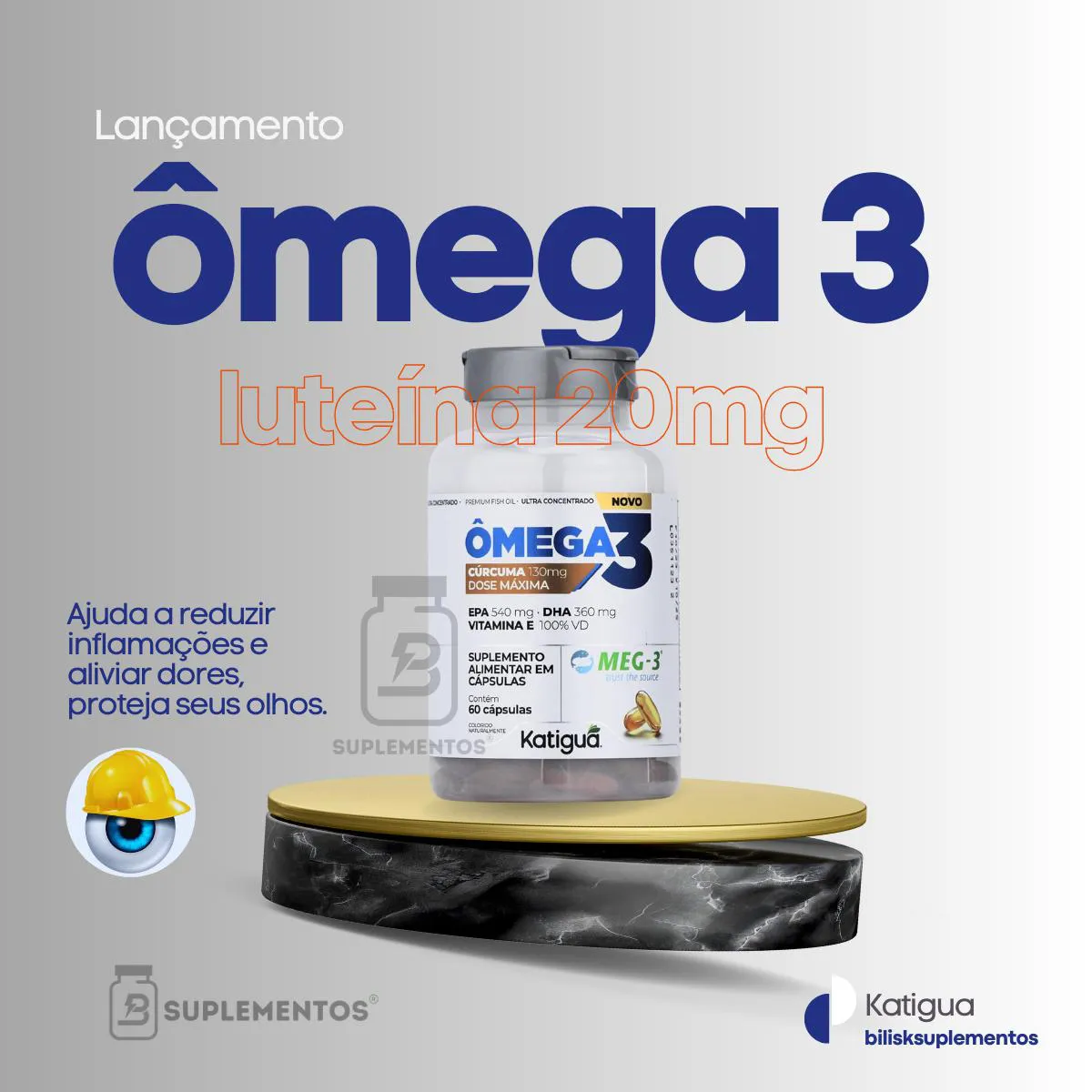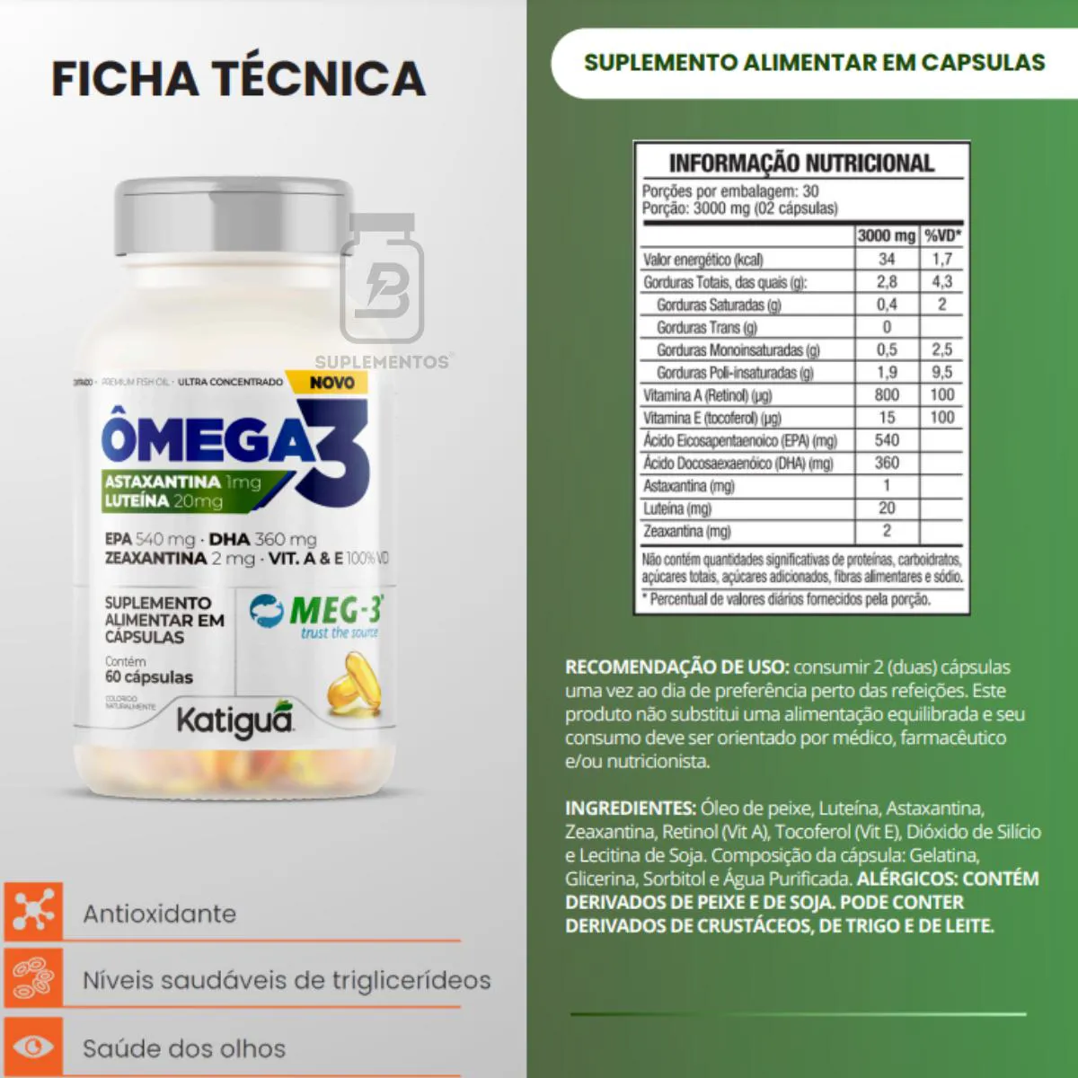 Suplemento alimentar premium com óleo de peixe concentrado MEG-3®, astaxantina, luteína e zeaxantina, desenvolvido para suporte antioxidante e proteção visual.Benefícios: