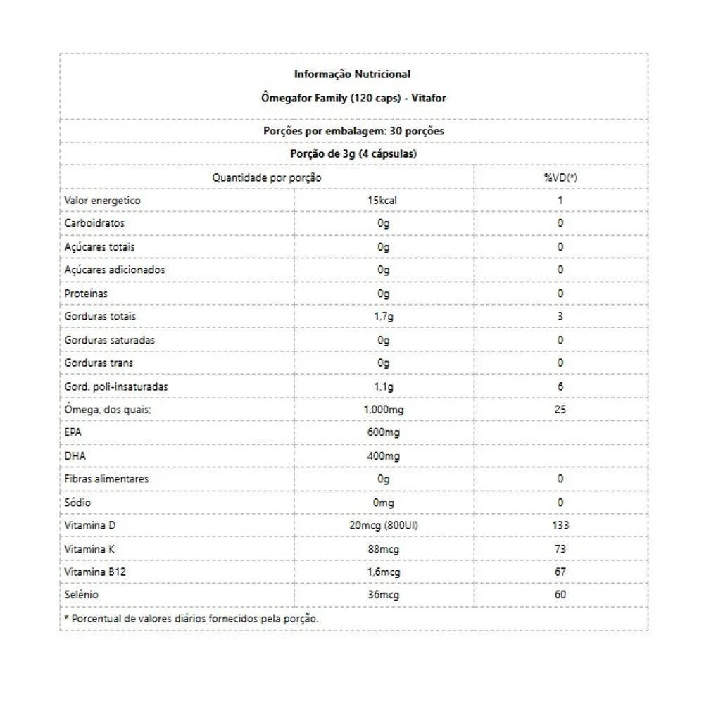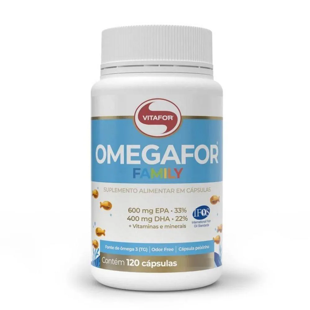 Ômegafor Family (120 caps) Como você tem cuidado do seu coração e do seu cérebro? Ômegafor Family Vitafor, é um suplemento alimentar à base de óleo de peixe (fonte de Ômega 3- TG), associado a vitamina B12, vitamina d, vitamina K e o mineral selênio, contribuindo para saúde e bem-estar de toda família de forma prática e diida, através de pequenas cápsulas no formato de peixinho. O Ômegafor Family traz em sua concentração 600mg EPA e 400mg DHA por dose recomendada. Nosso Ômega se apresenta na forma TG (triglicerídeos), para facilitar a absorção do corpo. Cada ser humano é único, por isso oferecemos diversas concentrações na família de ômegas, dessa forma atendemos as necessidades individuais, e as dosagens recomendadas para cada um por seu de saúde. A cápsula do Ômegafor Family é menor facilitando a ingestão de pessoas que tem dificuldade na deglutição. BENEFÍCIOS: - A vitamina B12, a vitamina D e o selênio auxiliam no funcionamento do sistema imune;- A vitamina B12 auxilia na formação de células vermelhas do sangue e no metabolismo da homocisteína;- A vitamina D auxilia na formação de ossos e dentes, na absorção de cálcio e fósforo, no funcionamento muscular e na manutenção de níveis de cálcio no sangue;- A vitamina K auxilia na coagulação do sangue e na manutenção dos ossos;- O selênio é um antioxidante que auxilia na proteção dos danos cas pelos radicais livres. Diferenciais: - Certificação do Programa Internacional de Padrões de Óleo de Peixe (IFOS );- Único programa de testes e certificação de terceiros para óleos de peixe;- Fonte de Ômega 3 (TG) maior absorção e conforto gástrico;- Extraído de águas frias e profundas de regiões polares;- Odor Free;- Fonte de Vitamina K, D, B12 e Selênio;- 600mg de EPA – 33% por porção;- 400mg de DHA – 22% por porção;- Cápsula pequena em formato de peixinho.- Selo de Qualidade VLabor.