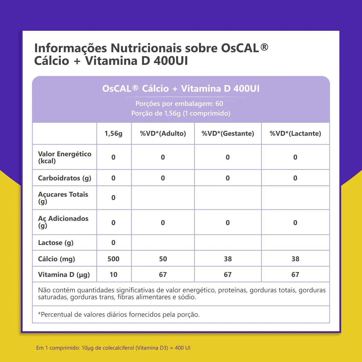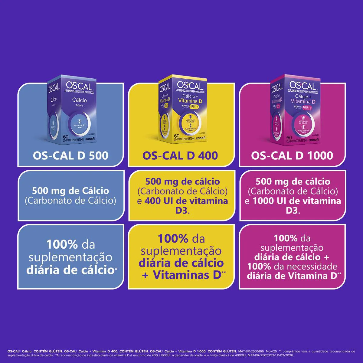 Os-Cal D 400UI é um suplemento alimentar em comprimidos formulado com 500mg de Cálcio e 400UI de vitamina D2.