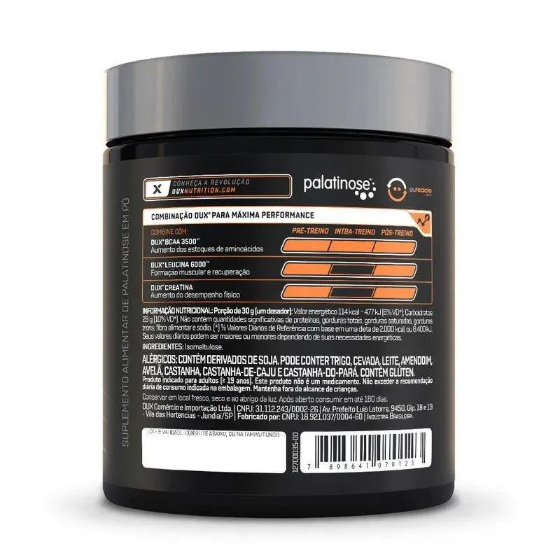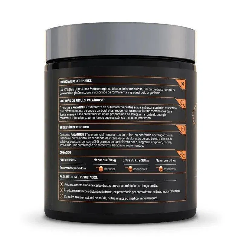 A Palatinose Dux Sem Sabor é uma fonte de carboidrato de baixo índice glicêmico, conhecida também como isomaltulose. Esta forma de carboidrato é gradualmente liberada no organismo, proporcionando energia de forma mais sustentada e prolongada em comparação com outros açúcares. Por ser sem sabor, pode ser facilmente adicionada a bebidas e alimentos sem alterar seu sabor original.