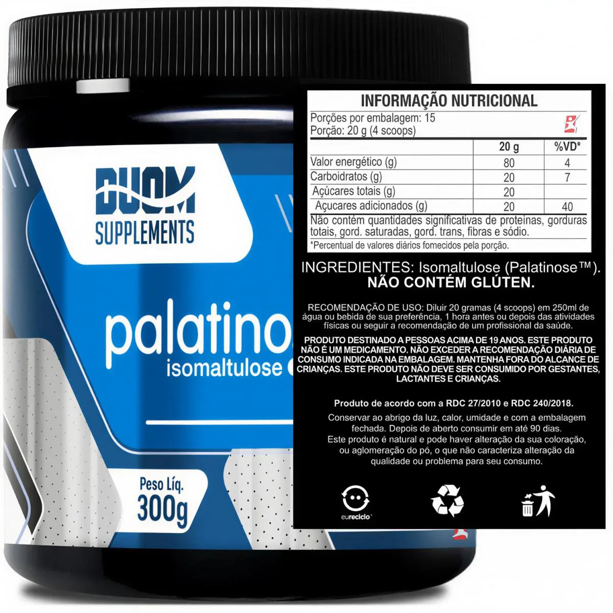 PALATINOSE ISOMALTULOSE 100% VEGANA SABOR NEUTRO 300G - DUOM DESCRIÇÃO A palatinose, também é conhecida como isomaltulose. Ela é um carboidrato de baixo índice glicêmico derivado da beterraba ou da cana-de-açúcar. A palatinose é digerida de forma mais lenta pelo organismo em comparação com outros açúcares, como a sacarose. Essa digestão lenta resulta em uma liberação gradual de glicose na corrente sanguínea, o que pode ajudar a manter os níveis de energia estáveis e evitar picos de açúcar no sangue. Com isso, torna-se uma opção popular entre atletas e pessoas que buscam melhorar a resistência durante exercícios prolongados. BENEFÍCIOS - 100% Palatinose; - 15 doses/porções POR FRASCO; - Produto vegano; - Com scoop dosador; - Sabor neutro; - Liberação gradual de glicose; - Pode auxiliar a manter os níveis de energia estáveis; - Pode melhorar a resistência durante exercícios prolongados; - Selo eureciclo. SUGESTÃO DE USO Diluir 20 gramas (4 scoops) em 250ml de água ou bebida de sua preferência, 2 horas antes ou depois das atividades físicas ou seguir a recomendação de um profissional de saúde. TABELA NUTRICIONAL -COMPOSIÇÃO & RECOMENÇÕES ANEXO NAS IMAGENS. DADOS TÉCNICOS Registro ANVISA – Produto de acordo com a RDC 27/2010 e RDC 240/2018. Marca – Duom. Conteúdo líquido total – 300 gramas. Rendimento líquido total – 15 doses/porções. Peso líquido total – 300g. Peso bruto total – 355g. Peso produto + embalagem (aproximado) – 450g. Código de barras (EAN) – 7898665752821. Dimensões do produto – largura 10cm; altura 9,5cm; comprimento 10cm. Dimensões da embalagem padrão – largura 13 cm; altura 12cm; comprimento 16cm. ITENS DO ANÚNCIO 1 Unidade do produto: