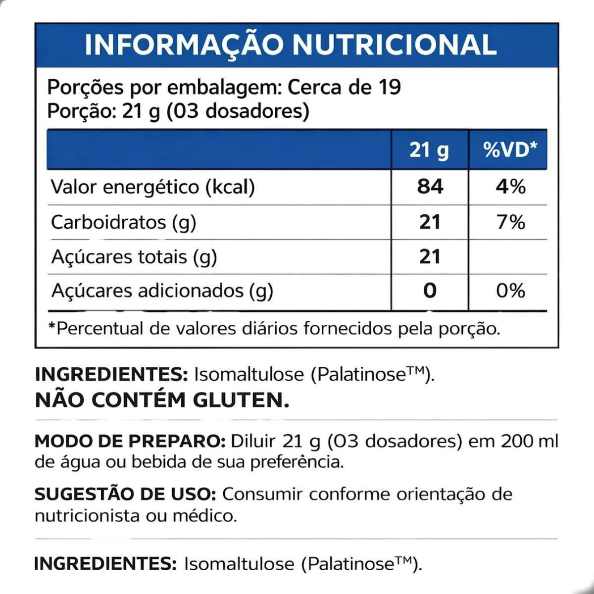 Sua composição isomaltulose de origem natural obtida da cana-de-açúcar, sem corantes, glúten ou lactose. e não inclui componentes de origem animal ou alergênicos comuns, adaptando-se a diferentes estilos de vida.