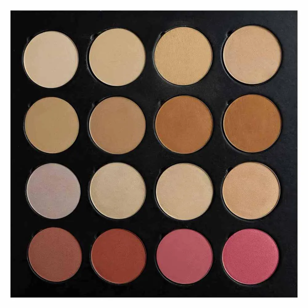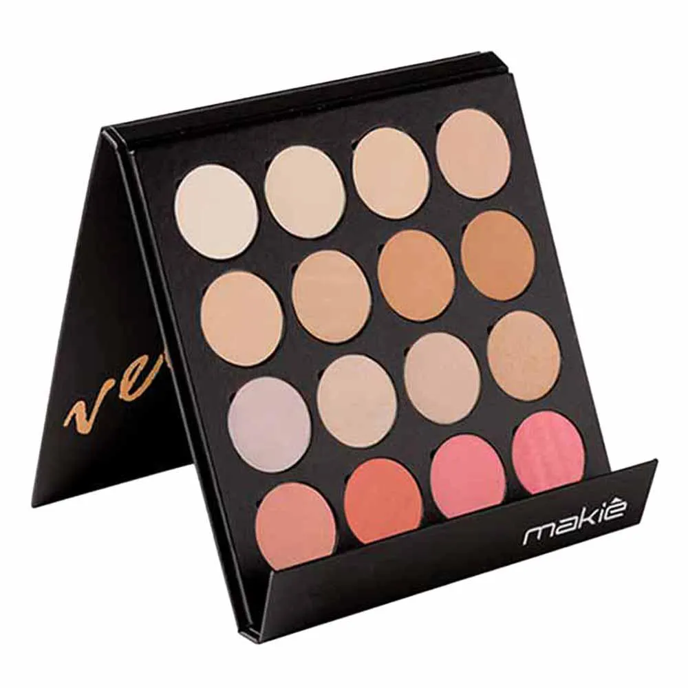 A Paleta de Maquiagem Makiê Velvet Mix é uma paleta multifuncional composta por 16 tons de pó compacto com efeito HD, incluindo pós faciais, iluminadores, blushes e bronzers.