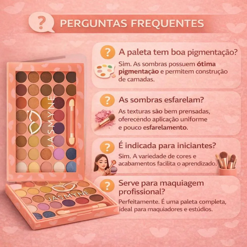 Descubra um universo de possibilidades com a Paleta De Sombras Jasmyne Com 36 Cores Ref.: Js12063 da JASMYNE. Esta paleta versátil é a ferramenta perfeita para criar desde looks sutis para o dia a dia até maquiagens dramáticas e elaboradas para ocasiões especiais. Com uma vasta gama de 36 cores e diversos acabamentos, ela atende tanto a maquiadores profissionais quanto a entusiastas da beleza que buscam qualidade e variedade em um único produto.Benefícios Principais