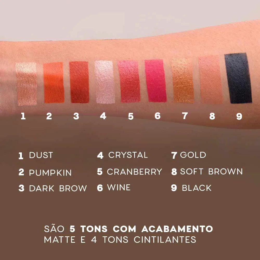 Composta por nove tons cuidadosamente selecionados, esta paleta oferece cinco cores opacas (Pumpkin, Dark Brown, Wine, Soft Brown e Black) que são ideais para criar bases sólidas ou adicionar profundidade ao seu visual.