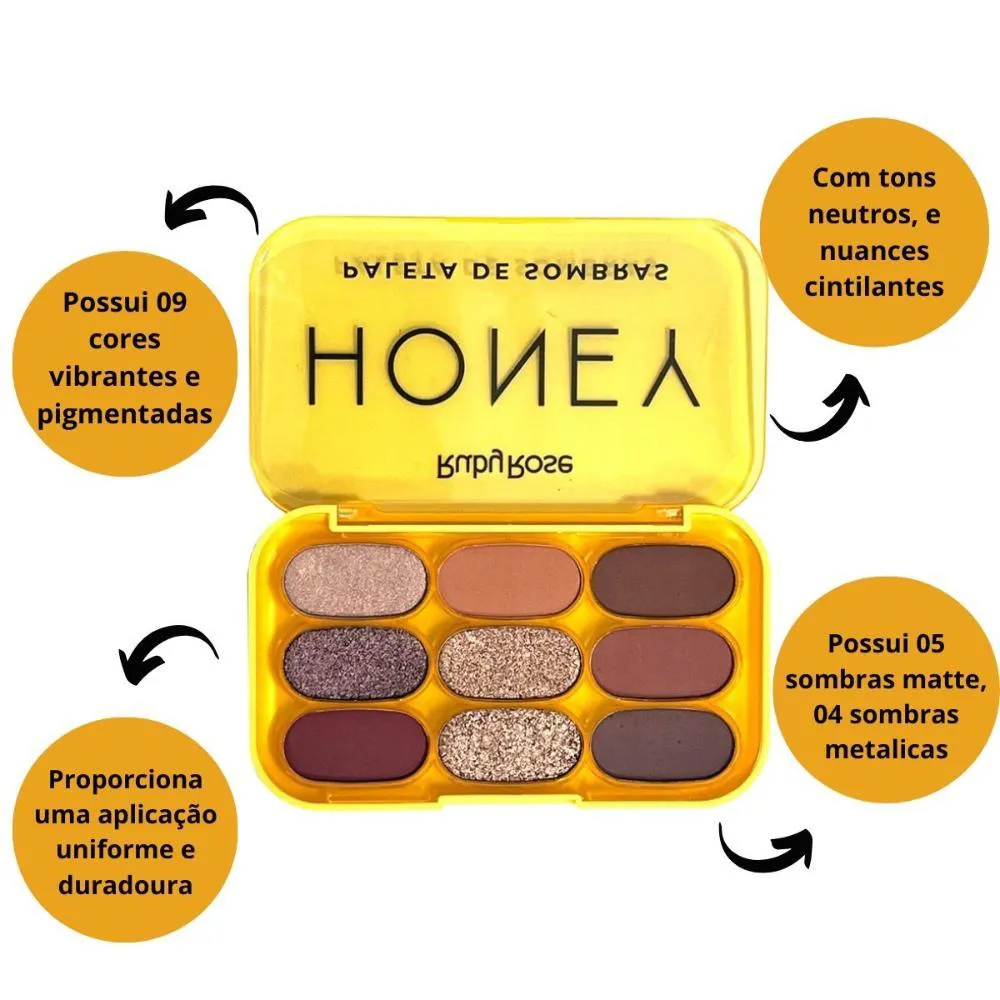 Paleta de Sombras Honey A Paleta de Sombras Honey possui 09 cores vibrantes e pigmentadas, desde tons neutros para o dia a dia até nuances ousadas para a noite, proporciona infinitas possibilidades para se maquiar. As sombras são macias e pigmentadas, proporcionando uma aplicação uniforme e duradoura. Possui 05 sombras matte, 04 sombras metalicas. . Modo de Uso: Comece aplicando uma sombra de transição em toda a pálpebra para criar uma base uniforme para a maquiagem dos olhos. Em seguida, escolha uma sombra mais escura para adicionar profundidade ao côncavo e à área externa do olho. Se desejar, escolha uma cor vibrante para adicionar um toque de cor à pálpebra. Esfume bem as sombras para garantir uma transição suave entre as cores. Use um pincel pequeno para aplicar sombra na linha dos cílios inferiores e misture suavemente. Adicione delineador e rímel para completar a make. . Detalhes: - Lindas tonalidades. - Perfeita para esfumar. - Longa Durabilidade. - Alta pigmentação.