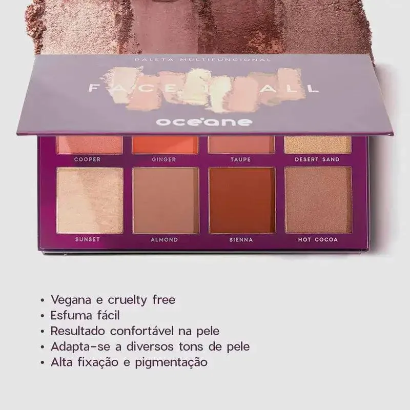 Paleta multifuncional com 8 cores. Océane Purple Face It All traz blush, iluminador, bronzer e contorno com alta pigmentação e fixação, com tons versáteis para uma maquiagem incrível. A Paleta Multfuncional Océane Purple Face It All é um produto versátil com cores para iluminar, realçar pontos do rosto, dar definição e um toque de cor. Possui 4 Tons Matte e 4 Tons Cintilantes. Com essa paleta multifuncional, o rosto ganha destaque e definição com apenas um produto. Os tons de acabamento matte são: Ginger, coral marcante, Sienna, marrom indispensável, Taupe, puxado para o rosa, e Almond, marrom mais claro. Já os cintilantes são: Sunset, rosado claro, Hot Cocoa, marrom radiante, Desert Sand, com um toque de areia dourada, e Cooper, rosado mais escuro. A embalagem possui um espelho acoplado para que você possa simplesmente pegar a paleta, seu pincel de maquiagem e se maquiar. Produto vegano e cruelty free.