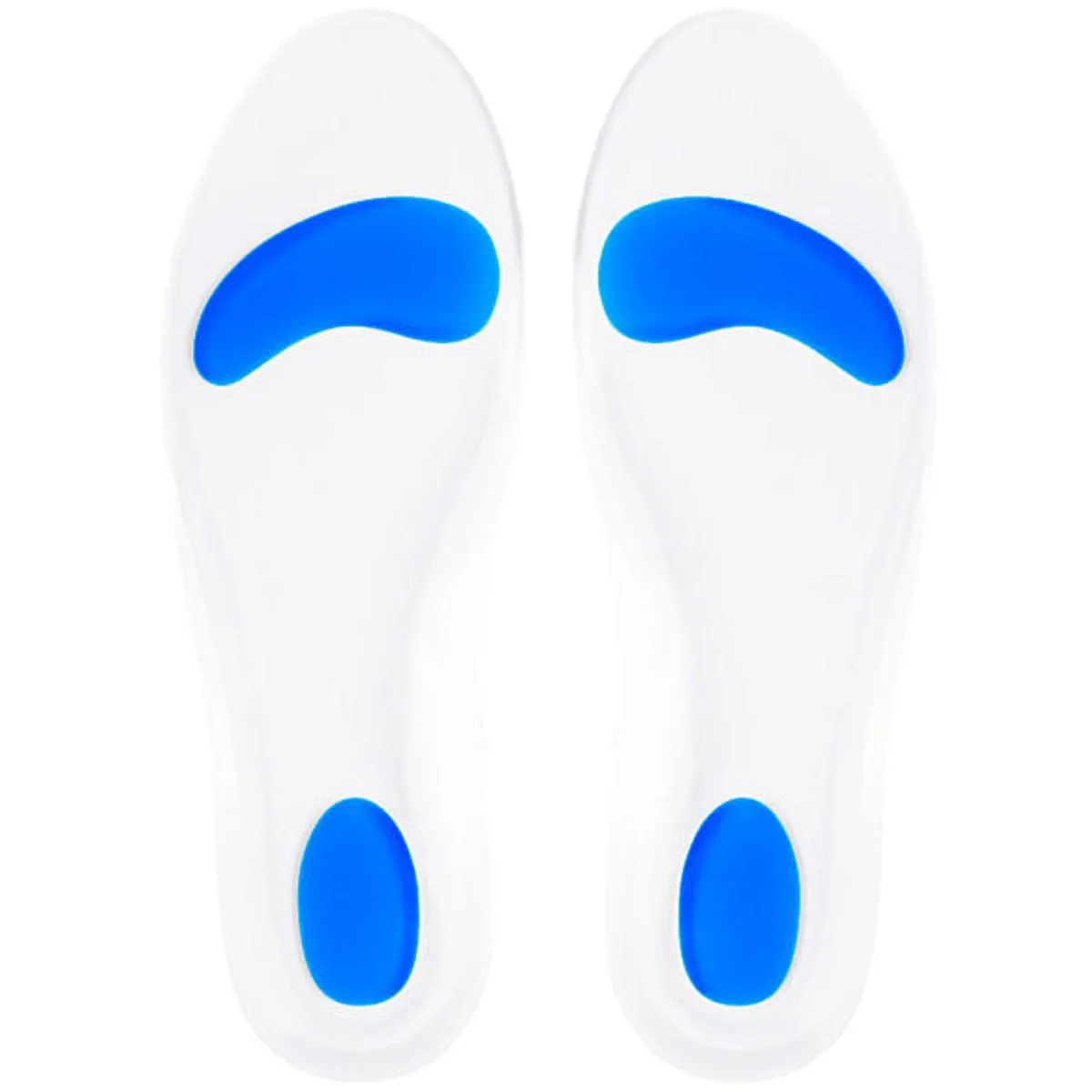 - ✔ Pontos Azuis Estratégicos de Amortecimento: O design inovador incorpora áreas de silicone com menor densidade (pontos azuis) no calcanhar e na região metatarsal. Essas zonas mais macias atuam como "almofadas" de alívio de pressão, direcionando o amortecimento para as áreas mais sensíveis e doloridas, como no caso de esporão de calcâneo e metatarsalgia.