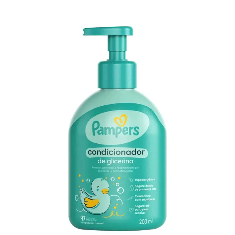 Pampers condicionador de Glicerina – 200 ml O Condicionador de Glicerina Pampers foi formulado especialmente para desembaraçar e condicionar suavemente os fios delicados do bebê durante o banho. Com ativos naturais e livre de agentes irritantes, garante maciez, brilho e cuidado seguro desde os primeiros dias de vida. Características: