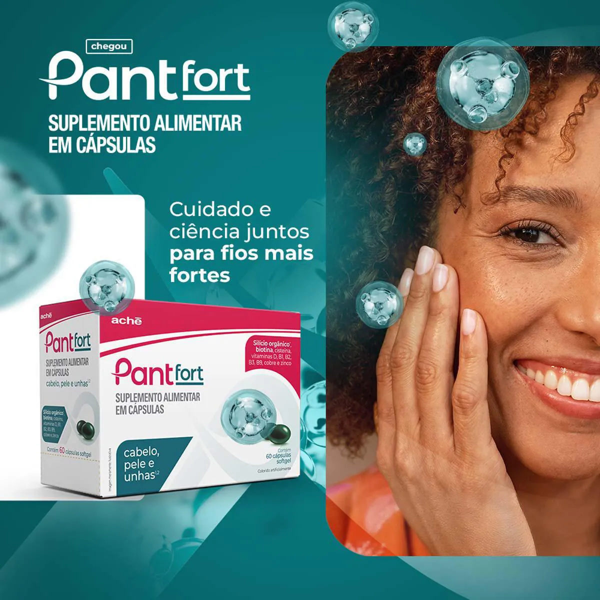 Pant Fort é um suplemento alimentar desenvolvido para fortalecer cabelos e unhas, oferecendo suporte nutricional por meio de vitaminas e minerais essenciais. Sua fórmula atua para aumentar a resistência dos fios, reduzir a queda capilar, melhorar o brilho e estimular o endurecimento das unhas. É indicado para quem busca complementar a alimentação e promover mais saúde e vitalidade para cabelo, unhas e pele.