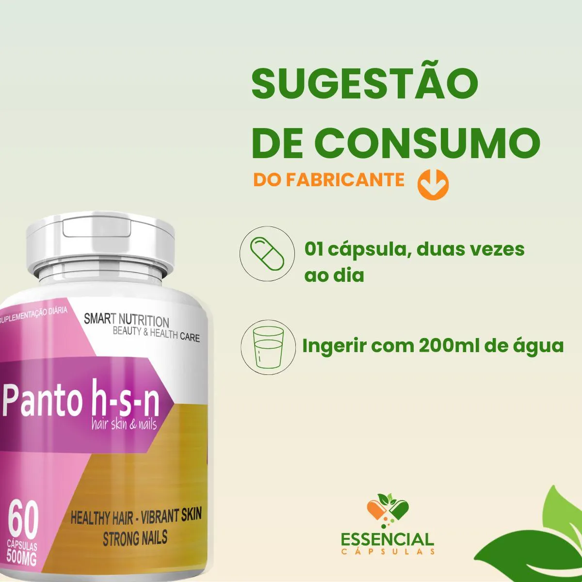 BEM VINDO(A) À ESSENCIAL CÁPSULAS Aqui, acreditamos que cuidar da saúde pode (e deve) ser algo natural, leve e diário. PRODUTO: - Panto H.S.N MARCA: - 4Elementos BENEFÍCIOS: ● Presente em rotinas de cuidado com a beleza de dentro para fora ● Combinação de nutrientes voltada ao cuidado com cabelos e unhas SUGESTÃO DE CONSUMO (PELO FABRICANTE): - 1 cápsula duas vezes ao dia - Ingerir com 200ml de água IMPORTANTE SABER: - Este produto é um suplemento alimentar natural. - Não é medicamento e não substitui uma alimentação equilibrada nem o acompanhamento de um profissional da saúde. - Como um produto natural, seus benefícios podem ser vistos a partir de alguns dias do uso. - Os suplementos são destinados a pessoas saudáveis. Sua finalidade é fornecer nutrientes, substâncias bioativas, enzimas ou probióticos em complemento à alimentação. COMPOSIÇÃO: - PANTOTENATO DE CÁLCIO, CISTINA, NITRATO DE TIAMINA, LEVEDURA MEDICINAL, QUERATINA E ÁCIDO AMINOBENZÔICO. NÃO CONTÉM GLÚTEN CONTRAINDICAÇÃO: - O uso não é recomendado para gestantes, lactantes e crianças. - Em caso de uso contínuo de medicamentos ou condições específicas de saúde, busque a orientação de um profissional da saúde. QUALIDADE: - Sabemos que o mercado de suplementos é competitivo, com opções para todos os públicos e faixas de preço. Na nossa loja, priorizamos a qualidade em cada detalhe. Por isso, escolhemos trabalhar apenas com fábricas que utilizam matérias-primas de excelência e seguem rigorosos padrões de produção. ENVIAMOS RAPIDINHO: - Seu pedido é preparado com todo cuidado e postado em até 24 horas úteis após a confirmação da compra. (Na maioria das vezes, enviamos bem antes disso)! FALE CONOSCO: Tem dúvidas ou quer conversar sobre o produto? Nosso atendimento é humanizado e está sempre pronto para te ouvir com muita atenção!