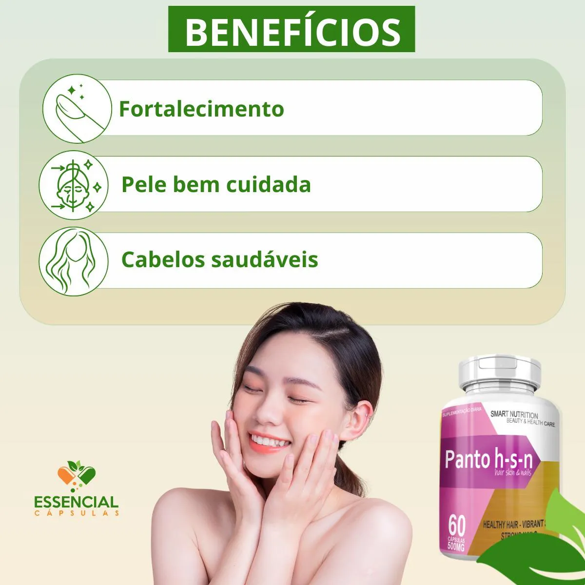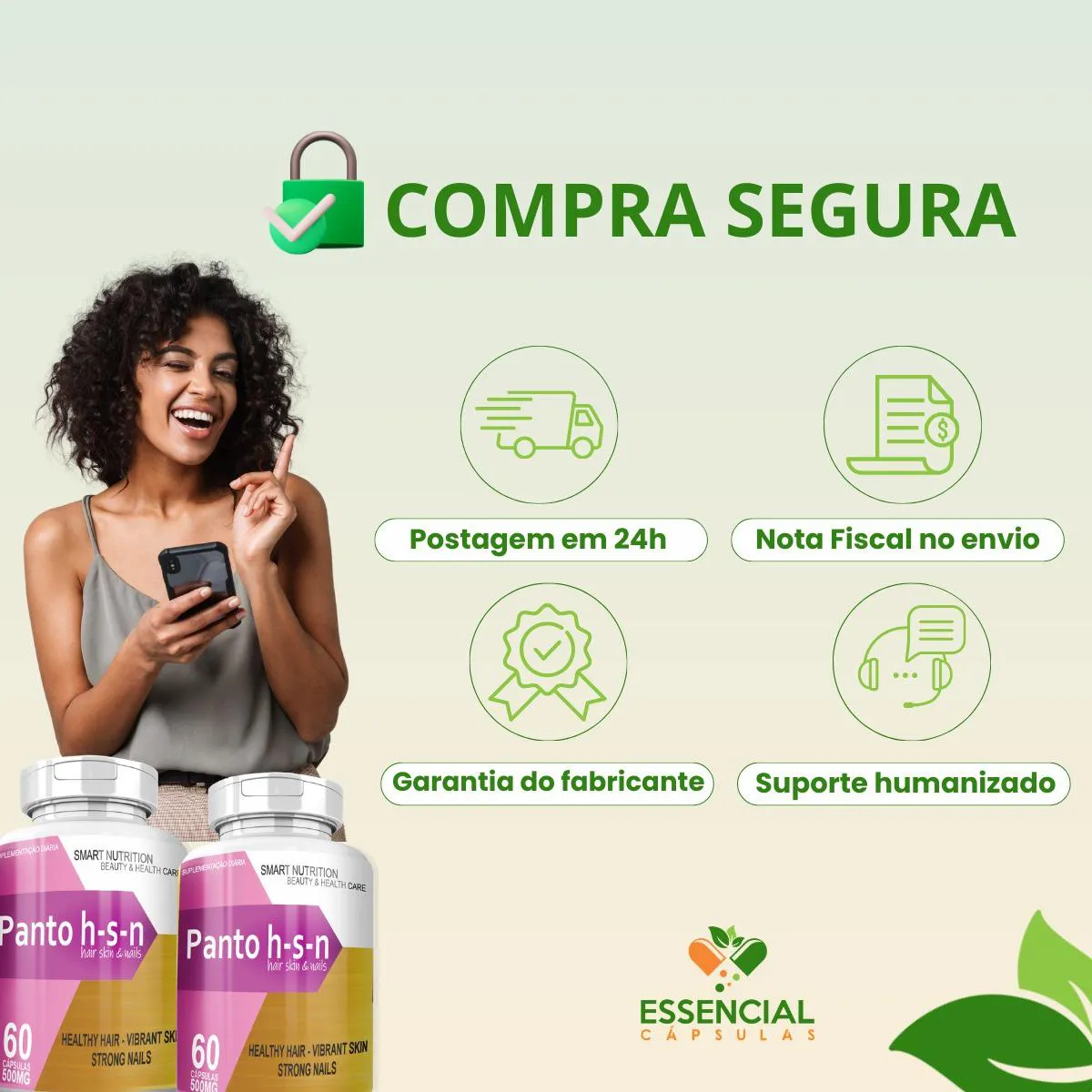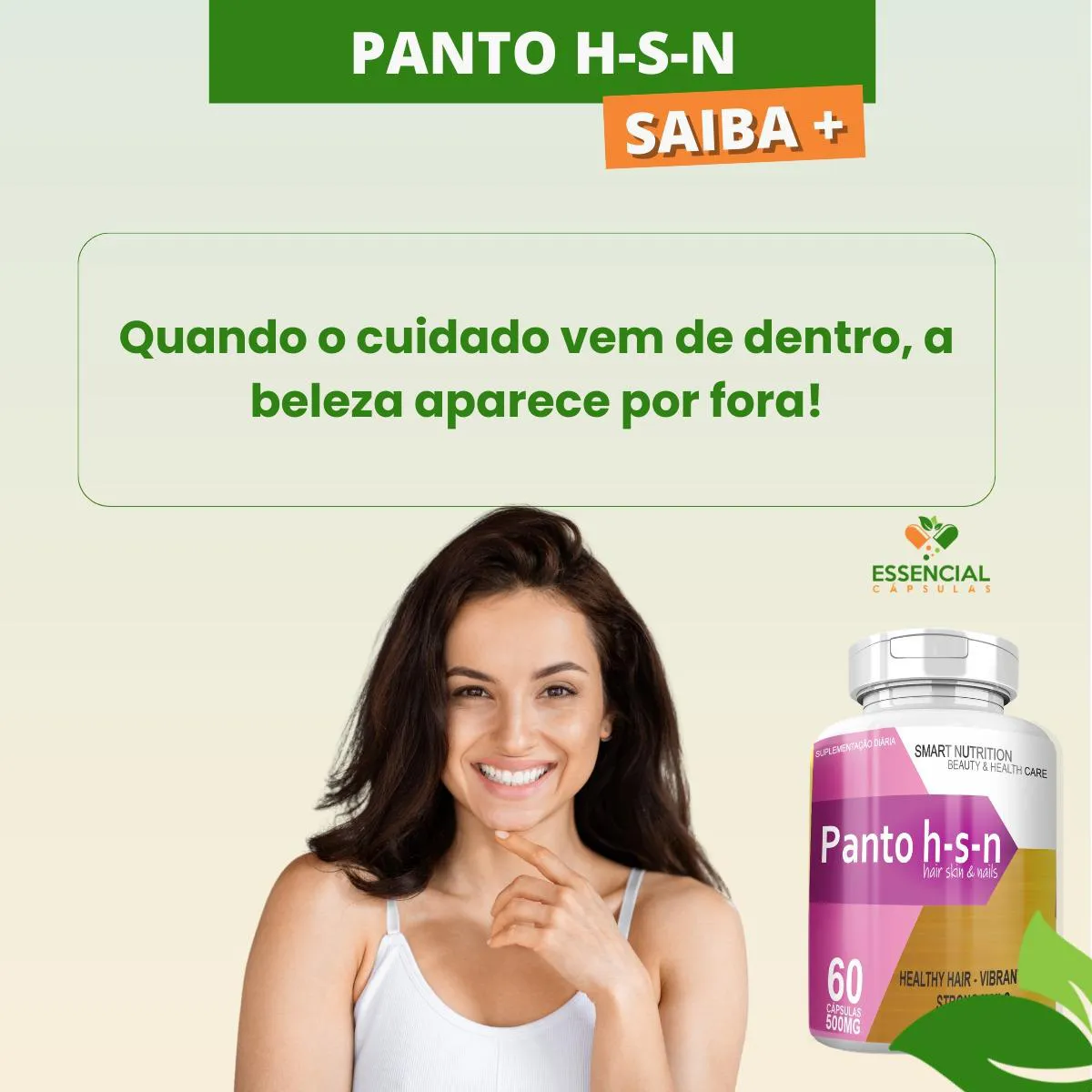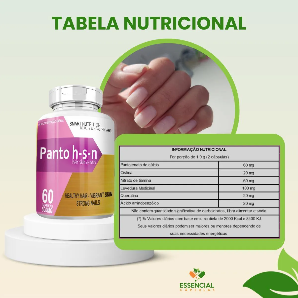 BEM VINDO(A) À ESSENCIAL CÁPSULAS Aqui, acreditamos que cuidar da saúde pode (e deve) ser algo natural, leve e diário. PRODUTO: - Panto H.S.N MARCA: - 4Elementos BENEFÍCIOS: ● Presente em rotinas de cuidado com a beleza de dentro para fora ● Combinação de nutrientes voltada ao cuidado com cabelos e unhas SUGESTÃO DE CONSUMO (PELO FABRICANTE): - 1 cápsula duas vezes ao dia - Ingerir com 200ml de água IMPORTANTE SABER: - Este produto é um suplemento alimentar natural. - Não é medicamento e não substitui uma alimentação equilibrada nem o acompanhamento de um profissional da saúde. - Como um produto natural, seus benefícios podem ser vistos a partir de alguns dias do uso. - Os suplementos são destinados a pessoas saudáveis. Sua finalidade é fornecer nutrientes, substâncias bioativas, enzimas ou probióticos em complemento à alimentação. COMPOSIÇÃO: - PANTOTENATO DE CÁLCIO, CISTINA, NITRATO DE TIAMINA, LEVEDURA MEDICINAL, QUERATINA E ÁCIDO AMINOBENZÔICO. NÃO CONTÉM GLÚTEN CONTRAINDICAÇÃO: - O uso não é recomendado para gestantes, lactantes e crianças. - Em caso de uso contínuo de medicamentos ou condições específicas de saúde, busque a orientação de um profissional da saúde. QUALIDADE: - Sabemos que o mercado de suplementos é competitivo, com opções para todos os públicos e faixas de preço. Na nossa loja, priorizamos a qualidade em cada detalhe. Por isso, escolhemos trabalhar apenas com fábricas que utilizam matérias-primas de excelência e seguem rigorosos padrões de produção. ENVIAMOS RAPIDINHO: - Seu pedido é preparado com todo cuidado e postado em até 24 horas úteis após a confirmação da compra. (Na maioria das vezes, enviamos bem antes disso)! FALE CONOSCO: Tem dúvidas ou quer conversar sobre o produto? Nosso atendimento é humanizado e está sempre pronto para te ouvir com muita atenção!