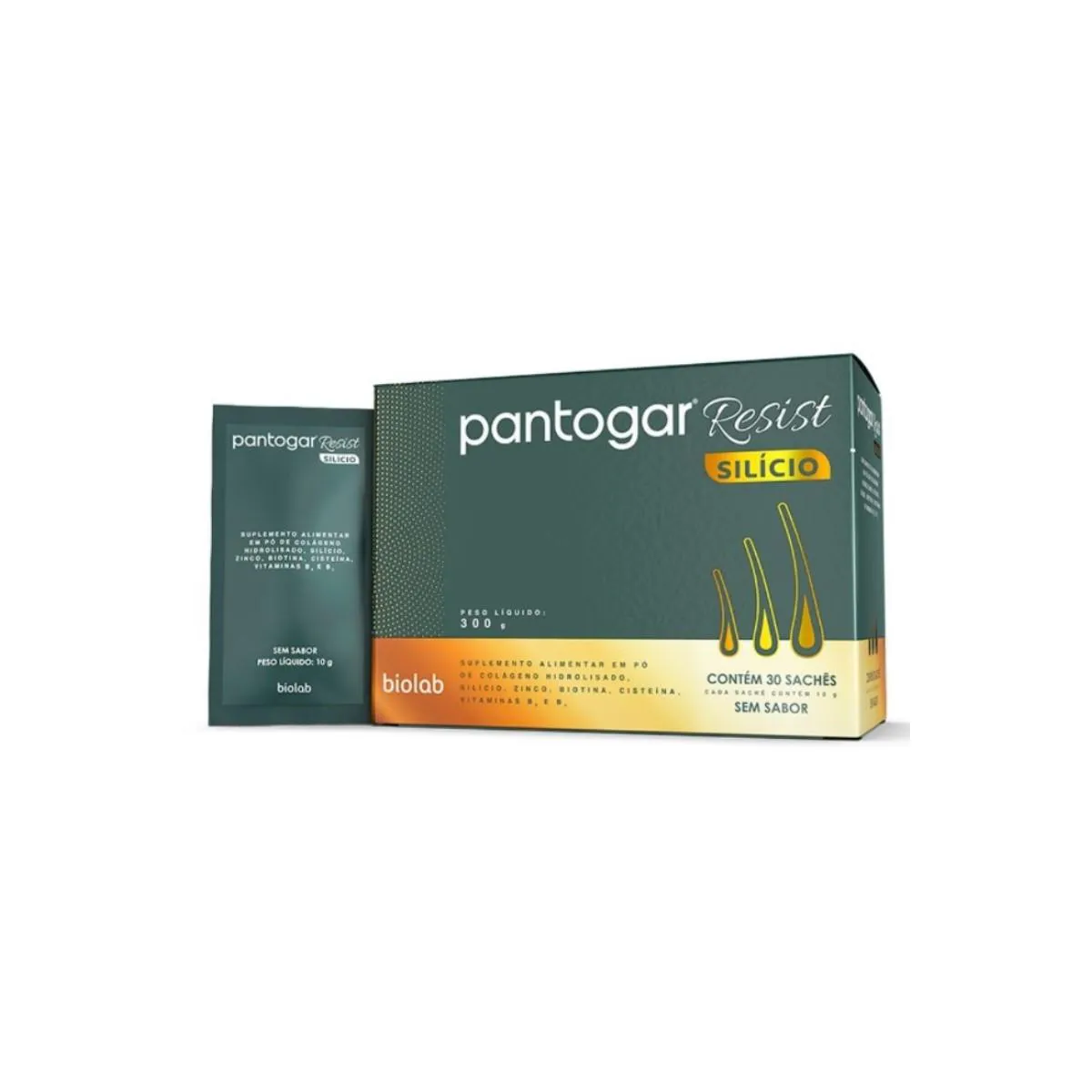 A fórmula de Pantogar Resist Silício conta com Silício Orgânico + colágeno Peptan® + Cisteína + Biotina + Zinco e é o primeiro produto exclusivo para o cuidado da queda de cabelos em sachês, o que facilita a adesão do paciente ao tratamento pela agradável e fácil posologia (um único sachê ao dia, sem sabor).