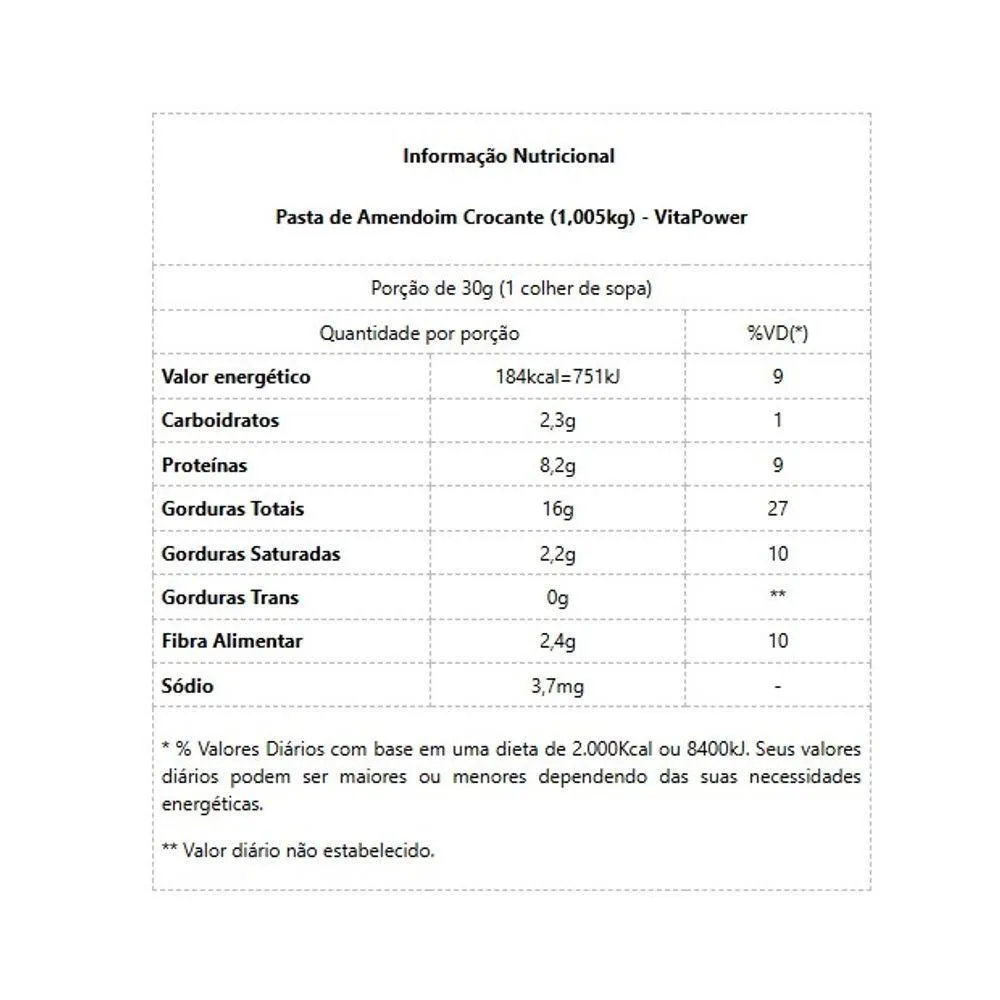 Pasta de Amendoim Crocante Vita Power A Pasta Integral de Amendoim VitaPower fornece energia de longa duração. Cada vez mais em alta nas dietas de quem malha, é fonte de proteínas, rica em gordura saudável, antioxidantes e tem baixo carboidrato, isso sem dizer que o sabor é delicioso! É ideal para todos os tipos de dietas, seja hipercalórica para pessoas que tem dificuldade em ganhar massa muscular ou hipocalórica que tem dificuldade em perder peso. A gordura presente na Pasta de Amendoim Vitapower é aquela considerada boa, são ácidos graxos poliinsaturados que protegem o corpo. Benefícios: - Zero aditivos, - 100% amendoim; - Zero açúcar; - Zero sódio; - Zero lactose; - Zero glúten; - Zero sódio; - Zero gordura trans.