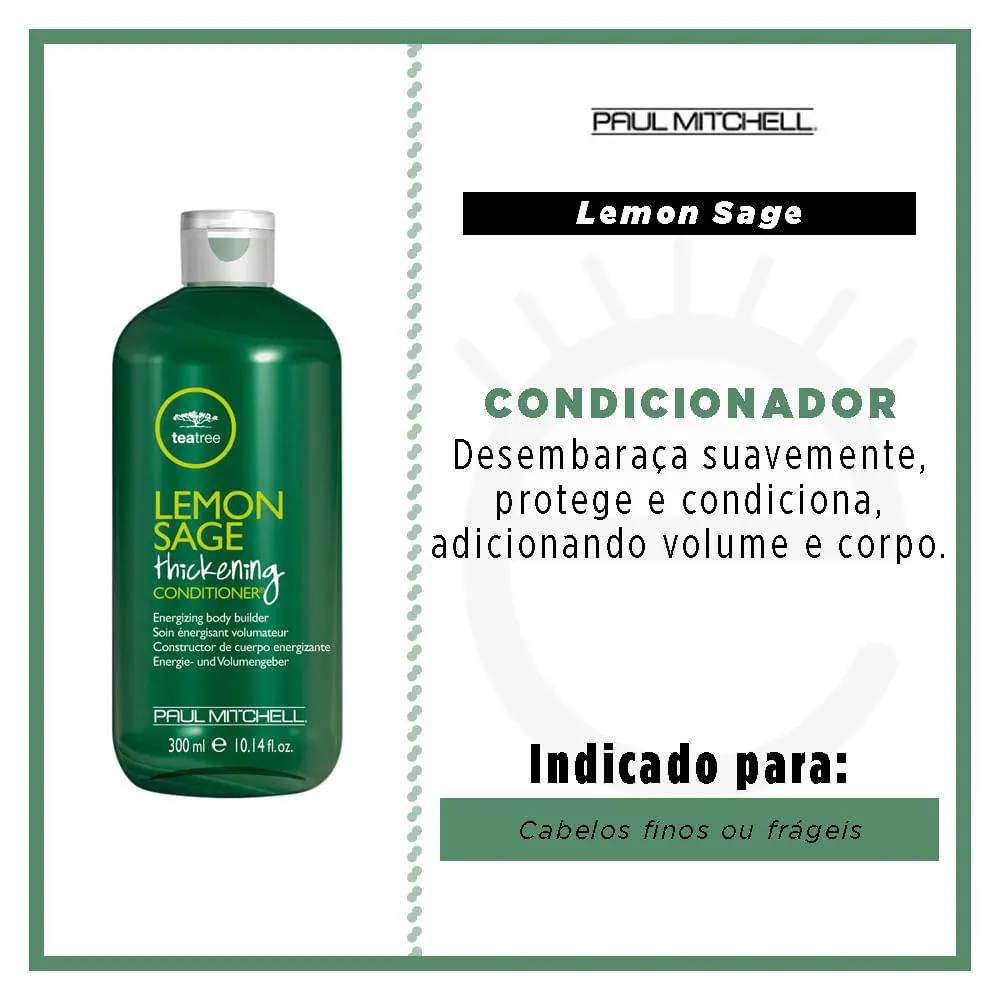 Tea Tree Lemon Sage Conditioner da Paul Mitchell é formulado para desembaraçar suavemente, proteger e condicionar, adicionando volume e corpo. O pantenol ajuda a encorpar e proteger os fios. O limão e a sálvia combinam-se ao óleo de chá da árvore australiana, à lavanda e à hortelã pimenta, para proporcionar uma sensação de fragrância limpa e fresca.