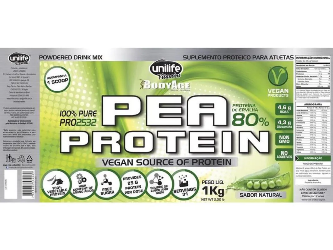 O Pea Protein é um suplemento proteico vegetal produzido a partir de 80% de proteína isolada de ervilha, desenvolvido especialmente para veganos e vegetarianos. Serve para fornecer todos os aminoácidos essenciais necessários para o bom funcionamento do organismo, oferecendo uma alternativa nutricional completa para pessoas com dietas que excluem proteínas de origem animal, auxiliando no fortalecimento do sistema imunológico, aumento de massa muscular e suporte nutricional geral.