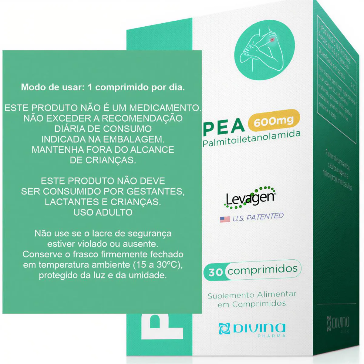 PEAFLAN PEA 600MG PALMITOILETANOLAMIDA LEVAGEN COM 30 COMPRIMIDOS - DIVINA  PHARMA   - descrição - INDÚSTRIA DO corpo PEAFLAN PEA 600 é um novo composto bioativo, cujo ingrediente-chave é a palmitoiletanolamida (PEA), que é a responsável pelo conjunto de ações do produto no organismo. A palmitoiletanolamida (PEA) é um ácido graxo componente natural dos lipídeos (gorduras). O organismo de humanos e de animais é capaz de produzir e de metabolizar PEA, e ela está presente também nas plantas. A produção de PEA no organismo humano ocorre a partir do ácido palmítico, um ácido graxo que está presente em alimentos como óleo de palma, carnes, queijos, manteiga e laticínios. A PEA foi descoberta há mais de 60 anos, como um nutriente biologicamente ativo presente em alimentos como a gema de ovo e lecitina de soja.   - benefícios - INDÚSTRIA DO CORPO - 600mg de PALMITOILETANOLAMIDA por comprimido - 600mg por porção; - Auxilia no combate às dores nas costas e articulares; - Tem ação analgésica; - Tem ação anti-inflamatória; - Auxilia aliviando a enxaqueca; - SEM GLÚTEN.   - sugestão de uso - INDÚSTRIA DO CORPO Sugere-se a ingestão 1 comprimido ao dia. Ingerir com líquidos.   - tabela nutricional - INDÚSTRIA DO CORPO - ANEXO NAS IMAGENS –   - composição - INDÚSTRIA DO CORPO - ANEXO NAS IMAGENS –   - recomendações - INDÚSTRIA DO CORPO - ANEXO NAS IMAGENS –   - dados técnicos - INDÚSTRIA DO CORPO Marca – Divina Pharma. Conteúdo líquido total - 30 Comprimidos Rendimento líquido total - 30 doses/porções. Peso líquido total – 37,08g. Peso produto + embalagem (aproximado) - 200g. Código de barras (EAN) - 7898966313288. Registro ANVISA - Produto dispensado de obrigatoriedade de registro conforme RDC nº27/2010. Dimensões do produto - altura 11 cm; largura 6 cm; comprimento 6 cm. Dimensões da embalagem padrão - altura 7 cm; largura 13 cm; comprimento 16cm.   - itens do anúncio - INDÚSTRIA DO CORPO 1 Unidade do produto: PEAFLAN PEA 600MG PALMITOILETANOLAMIDA LEVAGEN COM 30 COMPRIMIDOS - DIVINA  PHARMA Total - 30 Comprimidos.