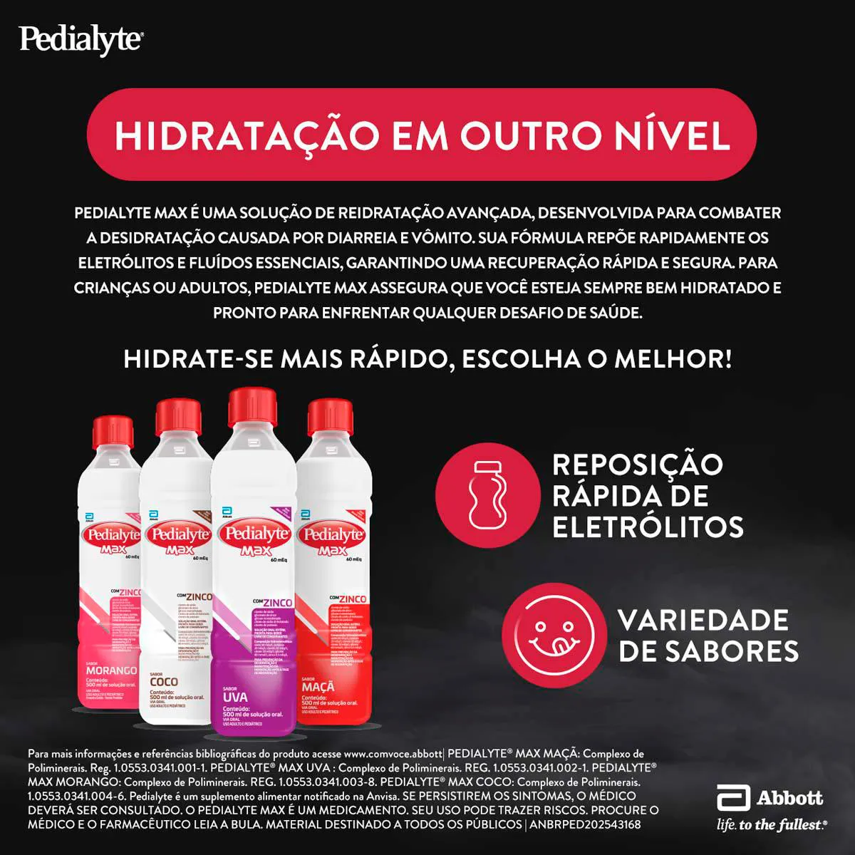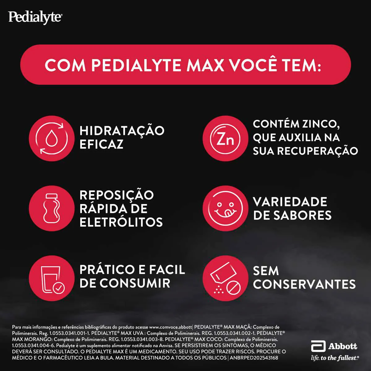 Pedialyte Max é um suplemento hidreletrolítico cientificamente desenvolvido para promover uma hidratação rápida e eficaz. colorido artificialmente, sua fórmula contém aromatizante sintético idêntico ao natural e 60 mEq/L de sódio. Ele está disponível no sabor morango em frasco com 500ml.