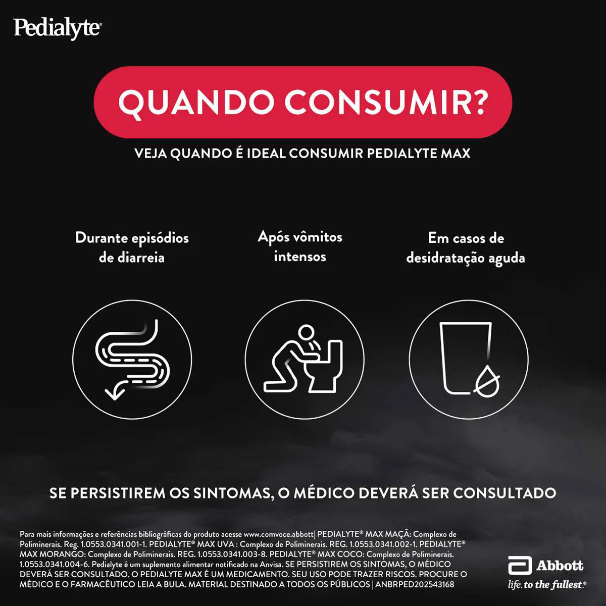 Com duas vezes mais sais minerais, Pedialyte Max é ideal para recuperação em casos de desidratação.