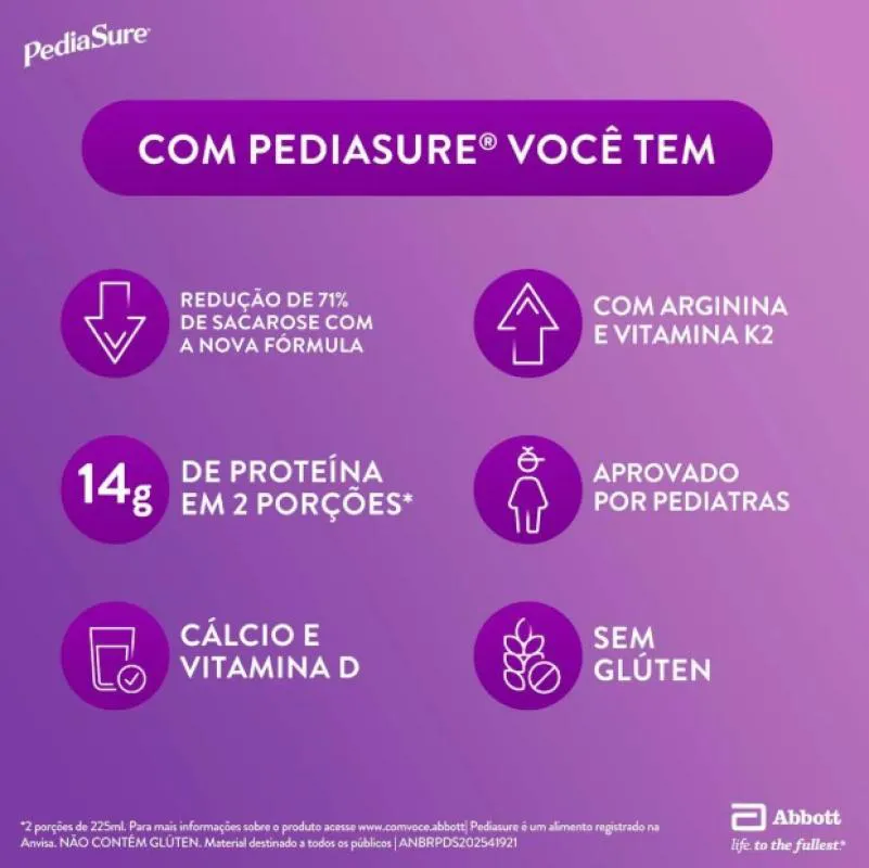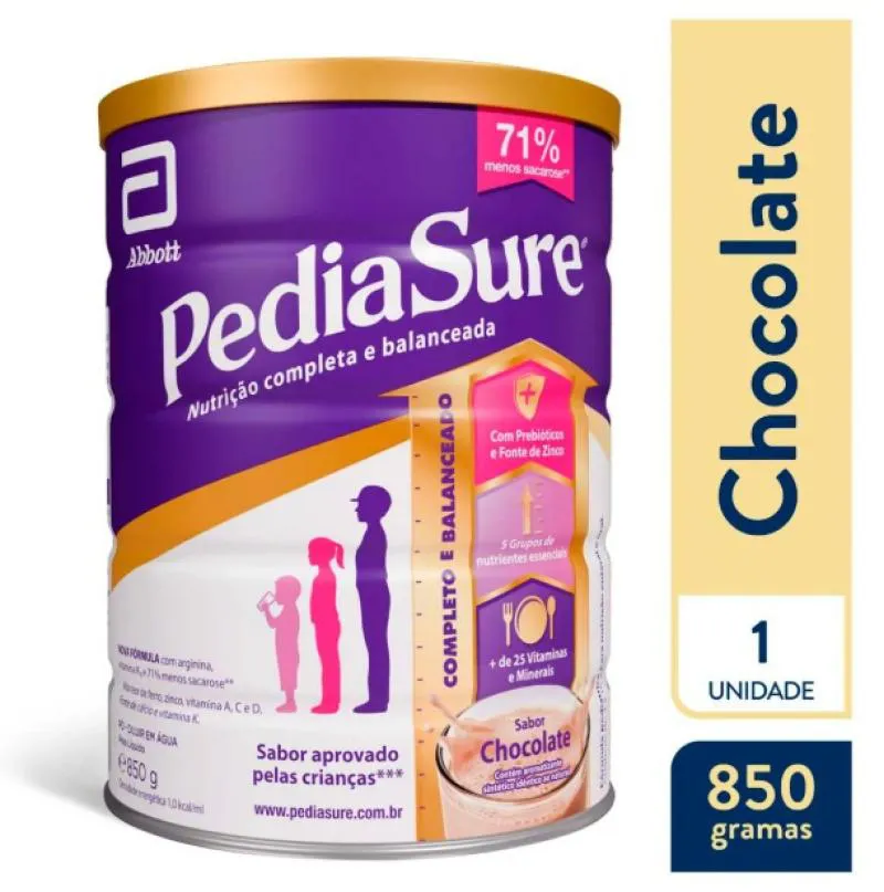 Pediasure é um complemento nutricional infantil com mais de 25 vitaminas e minerais, prebióticos e fonte de zinco, ferro, vitamina A, C e D. Criado para atender as necessidades nutricionais da criança em crescimento, Pediasure contribui para o desenvolvimento da criança e é indicado para nutrição completa e balanceada. Benefícios e diferenciais do Pediasure Com prebióticos e fonte de Zinco. Mais de 25 vitaminas e minerais. Criado para atender as necessidades nutricionais da criança em crescimento. Alto teor de ferro, zinco, vitamina A, C e D. Contribui para o desenvolvimento da criança. Indicado para nutrição completa e balanceada. Sabor aprovado pelas crianças. Sabor chocolate.