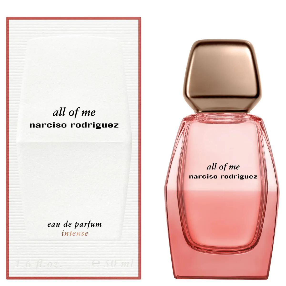 O frasco de All of Me Intense mantém a estética minimalista e elegante da linha, com linhas curvas e um tom rosado que evoca a feminilidade e a sofisticação.