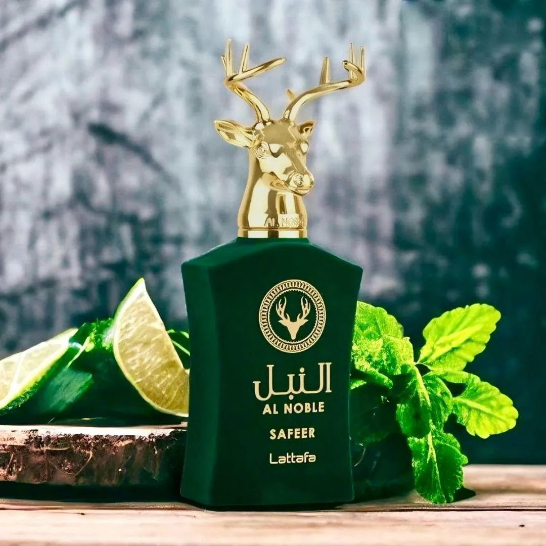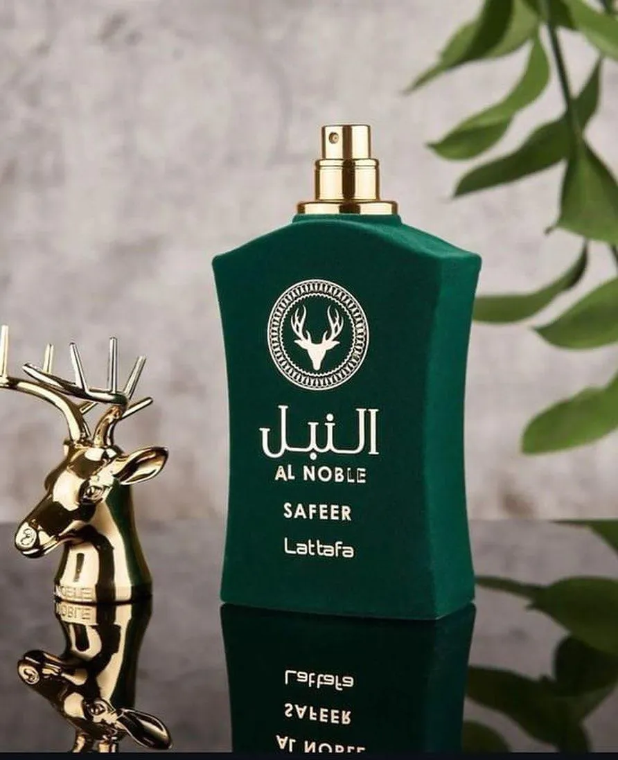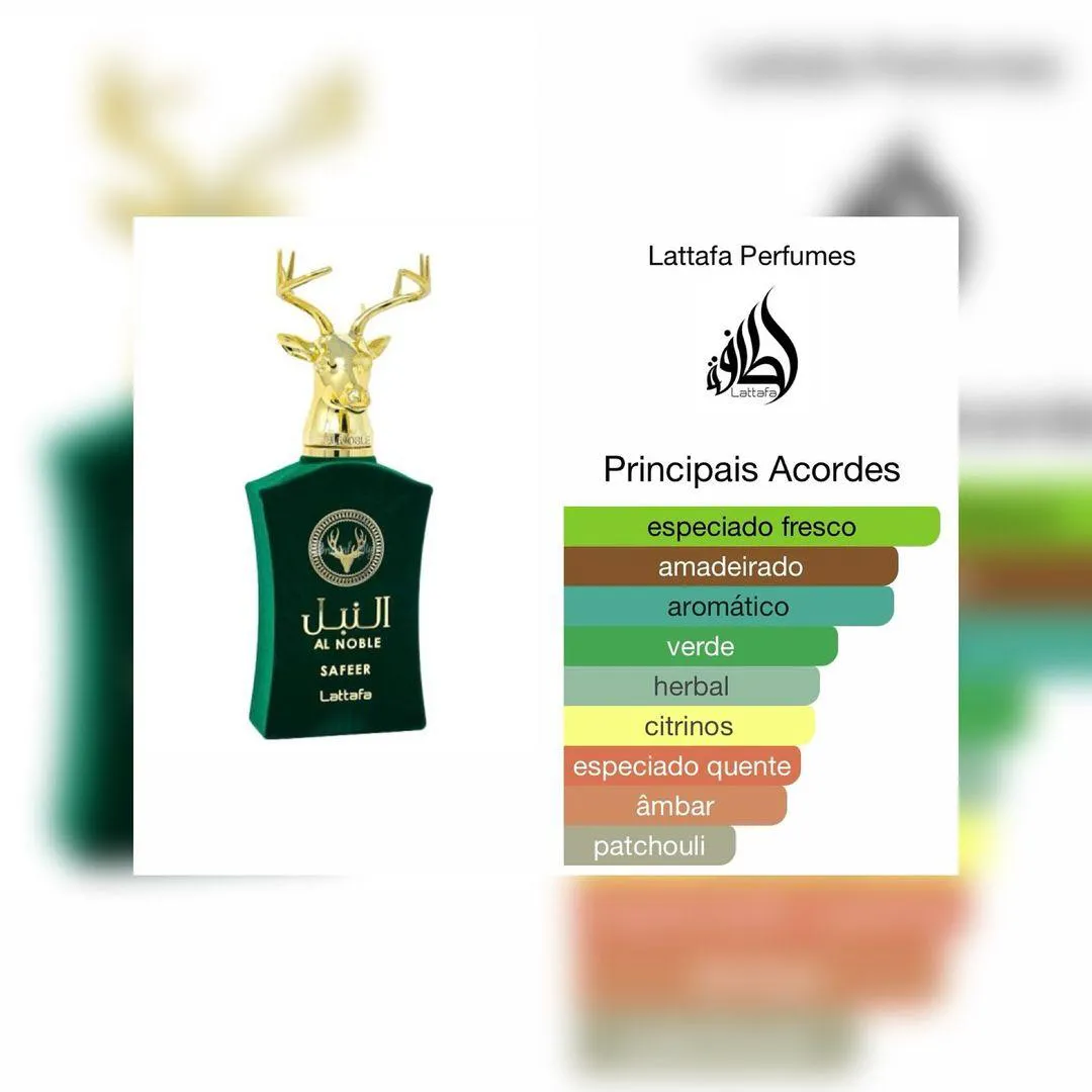 A base é terrosa, resinosa e amadeirada com noz de tigre, ládano, cominho, patchouli, olíbano, zimbro e madeira guaiac. Safeer Al Noble é uma fragrância clássica e alegre que se adapta a qualquer ocasião. Pirâmide Olfativa