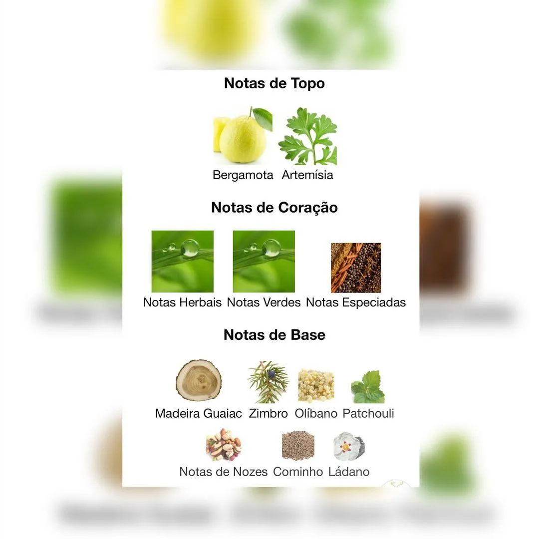 Notas de corpo: Notas Herbais, Notas Verdes e Notas Especiadas.