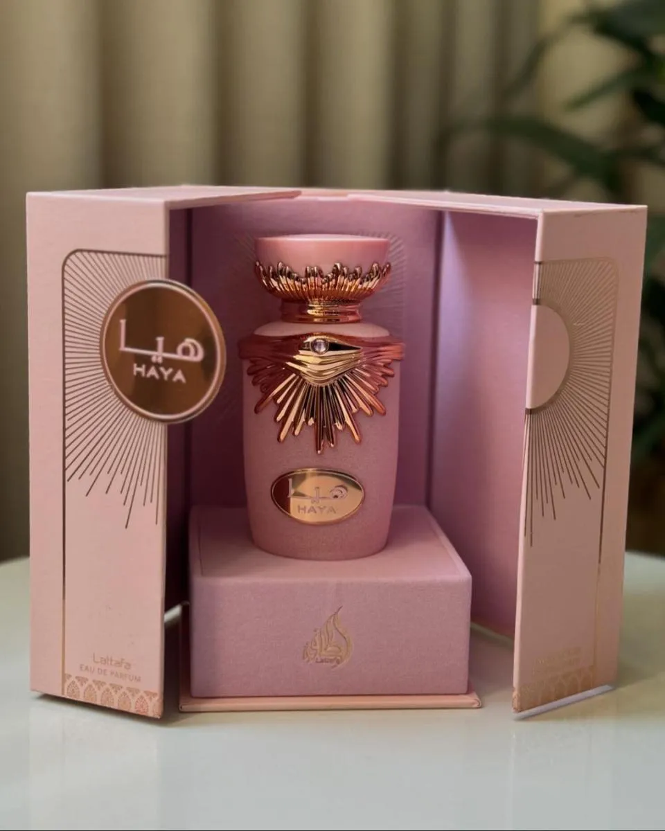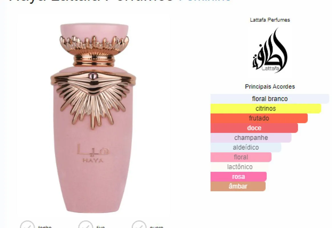 Lattafa Haya é uma fragrância feminina que cria uma atmosfera verdadeiramente luxuosa. Este perfume é uma combinação única de doçura e frescor, revelando os principais acordes florais da fragrância. A fragrância Lattafa Haya se destaca por seu aroma sutil, mas perceptível. Sua embalagem e design do frasco são realmente luxuosos, tornando esses perfumes um ótimo presente. Também são uma ótima opção para o uso diário, pois proporcionam frescor e energia ao longo do dia. Pirâmide Olfativa