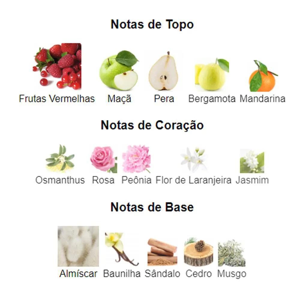 Notas de Topo: Frutas Vermelhas, Maçã, Pera, Bergamota e Mandarina.