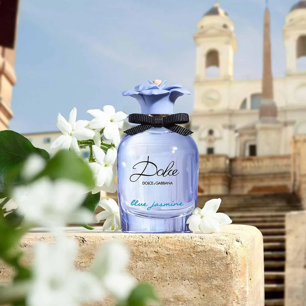 Dolce Blue Jasmine Eau de Parfum de Dolce&Gabbana está encapsulado no icônico frasco da coleção Dolce, banhado com um suave tom azul, coroado com uma tampa floral e decorado com uma elegante fita negra.