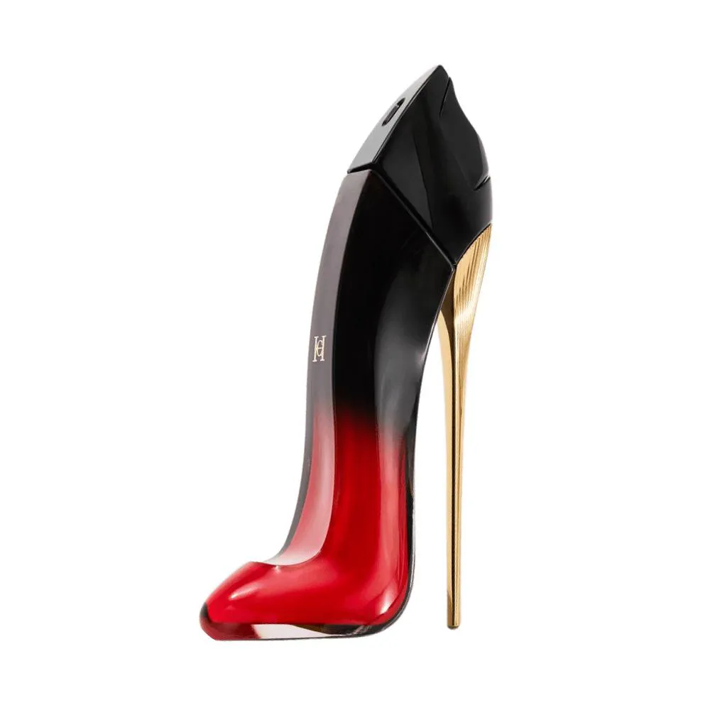 O frasco, em formato de stiletto, exibe um degradê que vai do vermelho intenso ao preto, finalizado com um salto dourado cintilante, simbolizando a ousadia, a sensualidade e a força da mulher contemporânea.