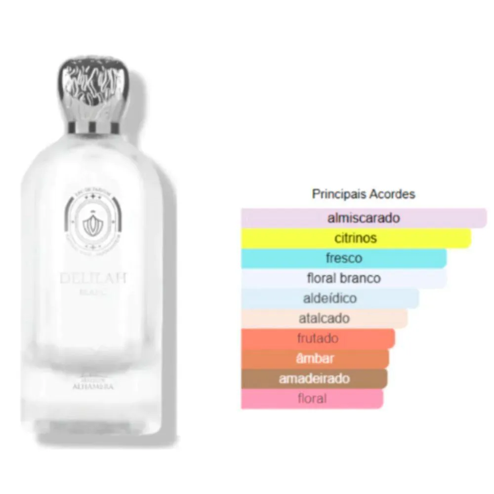 Perfume Delilah Blanc Maison Alhambra Eau de Parfum Feminino 100 ml é uma fragrância elegante que mescla frescor moderno com delicadeza floral, ideal para mulheres que apreciam sofisticação leve em qualquer momento do dia.A abertura luminososa apresenta uma combinação suave de bergamota, pêssego branco e tangerina, despertando os sentidos com uma brisa fresca e feminina.No coração, um buquê refinado de flor de laranjeira e vetiver adiciona profundidade e charme à composição, resultando em um aroma equilibrado que traduz confiança com sutileza.A base acolhedora une almíscar e baunilha, criando um rastro delicado porém duradouro ? perfeito para quem busca um perfume versátil, charmoso e memorável.Notas Olfativas:Notas de Topo: Bergamota, Pêssego Branco e Mandarina.Notas de Coração: Flor de Laranjeira e Vetiver.Notas de Fundo: Almíscar e Baunilha.*Imagens Meramente Ilustrativas.*As cores do produto podem variar de acordo com o monitor, a iluminação do ambiente e a sua percepção visual.*Verifique nossas políticas internas para que não haja nenhuma dúvida no processo de entrega ao finalizar a compra.
