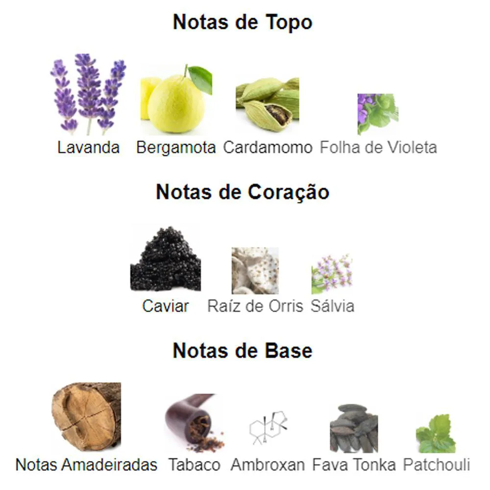 - Notas de Fundo: Tabaco, Fava Tonka, Ambroxan e Patchouli