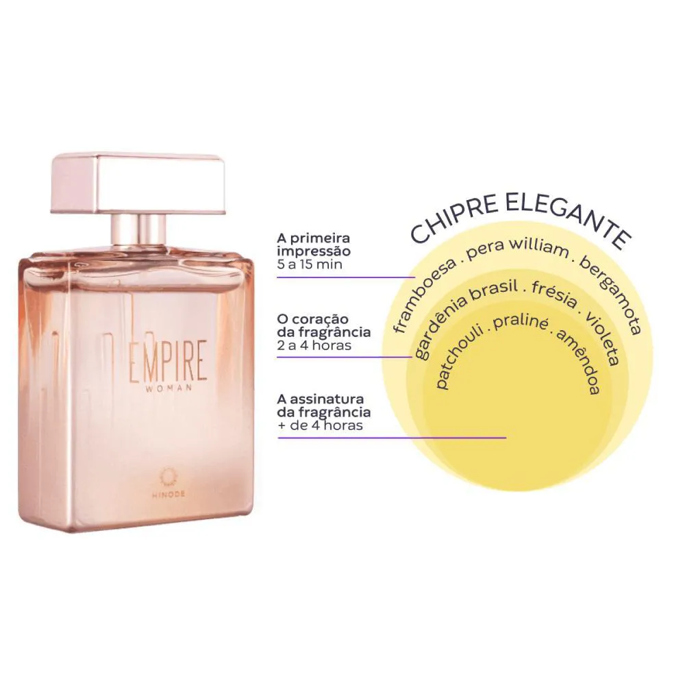 Empire Woman Deo Colônia HinodeEmpire Woman é a fragrância que representa mulheres protagonistas, admiradas por sua atitude e independência, que inspiram através de suas conquistas ao alcançar seus sonhos. Uma fragrância imponente com uma assinatura chipre, moderna e elegante. Nas notas de saída temos o frescor suculento e brilhante da Framboesa junto ao toque aquoso da Pêra. O corpo desta criação é assinado por um lindo e radiante buquê floral, trazendo a Gardênia Brasil como protagonista, uma flor poderosa e sedutora. Nas notas de fundo encontramos a força das madeiras e as notas adocicadas de Praline e Amêndoa, que envelopam esta estrutura de forma aditiva e envolvente.FAMÍLIA OLFATIVA: Chipre EleganteNOTAS OLFATIVAS:Topo: Framboesa, Pera William, BergamotaCorpo: Gardênia Brasil, Frésia, VioletaFundo: Patchouli, Praliné, AmêndoaModo de usoAplicar na pele para perfumar, conforme desejado, exceto no rosto e na região da mucosa.PRECAUÇÕESInflamável. Uso externo. Manter embalagem bem fechada e fora do alcance das crianças. Conservar em local fresco e seco. Manter o produto ao abrigo da luz e calor. Evite contato com os olhos. Em caso de contato, lavar imediatamente com água corrente em abundância. Suspender o uso em caso de sensibilização. Não utilizar sobre a pele irritada ou lesionada.ComposiçãoÁlcool Etílico, Água, Perfume, Propilenoglicol, Macrogol, Etilexilglicerina, Alfa-Isometil Ionona, Salicilato de Benzila, Citral, Citronelol, Cumarina, Eugenol, Farnesol, Geraniol, Hexil Cinamal, Hidroxicitronelal, Limoneno, Linalol.