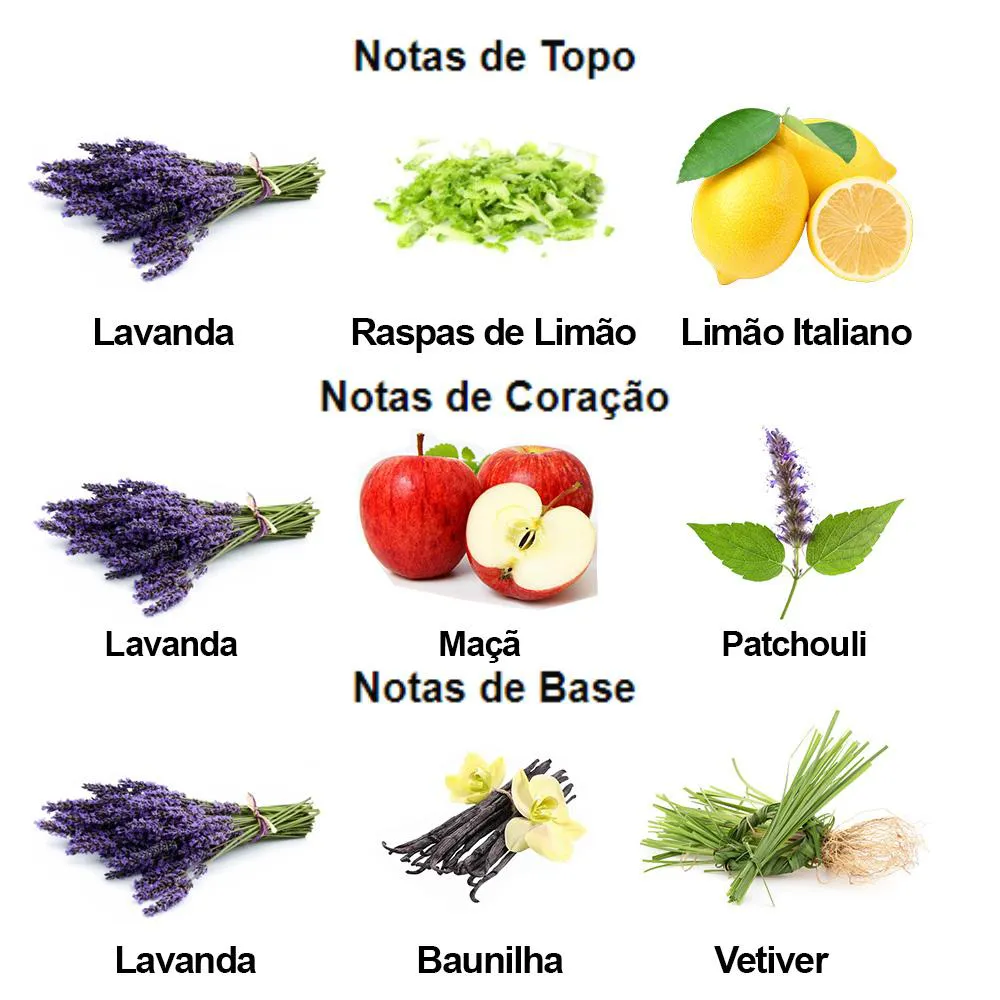 Notas de Topo: Lavanda, raspas de limão e limão italiano