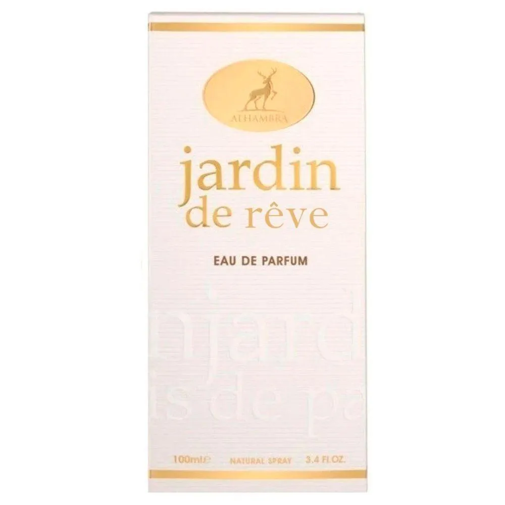 Perfume Jardin De Rêve Maison Alhambra Eau de Parfum Feminino 100 ml é uma fragrância encantadora que captura o frescor de um jardim dos sonhos em plena florada. Ideal para mulheres que desejam exalar feminilidade, frescor e elegância numa assinatura suave e atemporal.A abertura delicada é um sopro refrescante, com notas cítricas suaves, como bergamota e pera, despertando os sentidos com brilho e leveza.No coração, um buquê floral refinado de jasmim, flor de laranjeira e gardênia floresce com graciosidade, irradiando feminilidade e sofisticação. Essa combinação floral traz romantismo e clareza, criando uma aura luminosa ao redor de quem o veste.A base serena mistura almíscar branco e cedro suave, oferecendo aconchego discreto e fixação delicada. O rastro é elegante e persistente, perfeito para acompanhar o dia a dia com charme e sutileza.Notas Olfativas:Notas de Topo: Magnólia, Pera, Pêssego, Bergamota e Mandarina.Notas de Coração: Jasmim, Tuberosa, Frésia, Lírio-do-Vale, Orquídea, Violeta, Ameixa e Rosa.Notas de Fundo: Almíscar, Baunilha, Cedro e Amora.*Imagens Meramente Ilustrativas.*As cores do produto podem variar de acordo com o monitor, a iluminação do ambiente e a sua percepção visual.*Verifique nossas políticas internas para que não haja nenhuma dúvida no processo de entrega ao finalizar a compra.