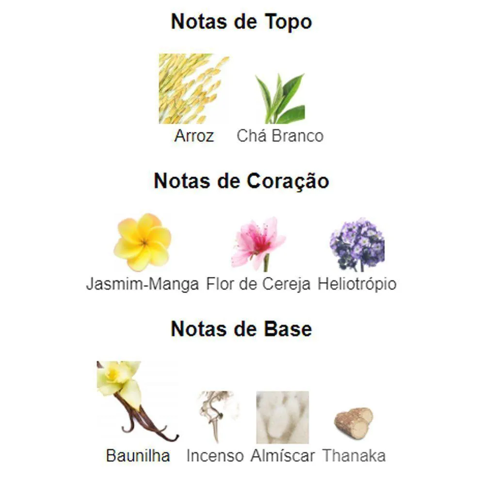 - Notas de Frangipani, Heliotrópio e Chá Branco.