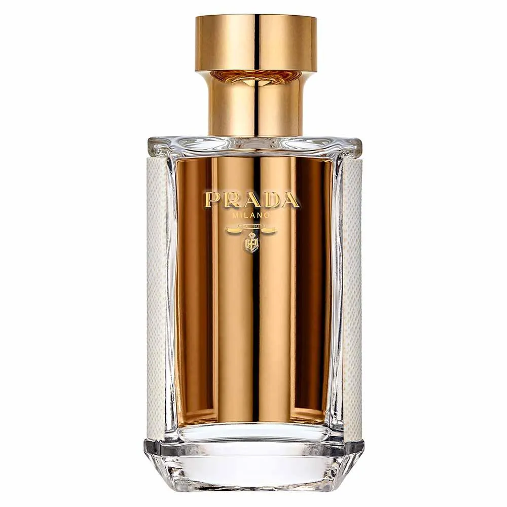 Um círculo cortado ao meio criando 2 identidades, possui a logo institucional Prada Milano, usada nas bolsas e acessórios da marca. Além disso, o frasco é coberto com couro saffiano branco, aplicado em uma peça de metal presa no vidro, atuado como um espelho dentro do frasco. A tampa é dourada, gravada com a estampa do couro saffiano nas laterais e com a logo de Prada no topo.