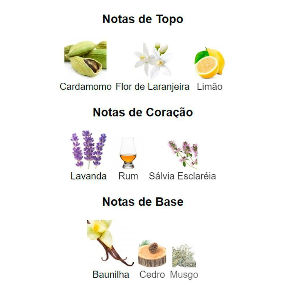 - Notas de lavanda, âmbar e baunilha.